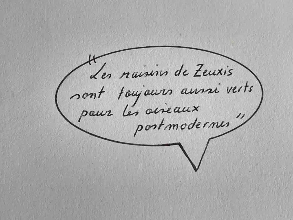 2. Zeuxis était un peintre grec qui vécut de -464 à -398. Il était le contemporain d’Apollodore « le peintre des ombres ». Il paraît que Zeuxis est mort de rire en faisant le portrait d’une vieille dame. Aucune de ses peintures n’a été conservée. Pline l’Ancien raconte qu’il avait peint un Enfant aux raisins, dont la grappe semblait si réelle qu’un oiseau serait venu picorer la peinture ! ↩︎