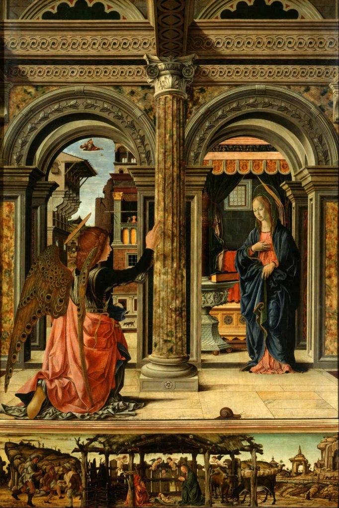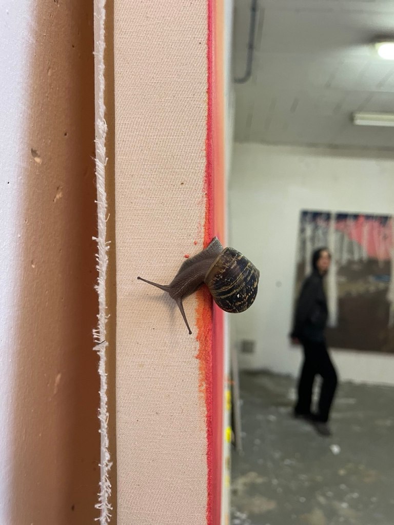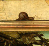 Pendant l’expo Pollen Prisé, un escargot a glissé longuement sur le bord de ma peinture Marionnette !!! Comme dans l’Annonciation de Francesco del Cossa que j’aime tant !!!