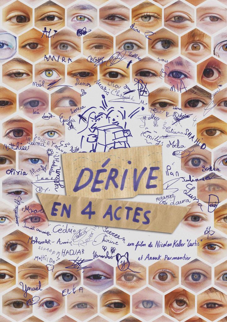 Dérive en 4 actes est un film qui change d’avis, d’âge et de point de vue. C’est le résultat de questions que nous nous sommes posées ensemble  : Comment conter le temps qui passe  ? Pourquoi on doit toujours compter les enfants avant chaque activité ? Comment on sait qu’on compte les un·es pour les autres ? Que voit une abeille qui cligne des yeux ? Comment un enfant voit un adulte, en contre-plongée ? Comment tu imagines ta vie, ton projet ? Ça fait quoi de passer au cinéma ? Est-ce qu’on pourra faire un film d’horreur svouuuplé ??!?!
