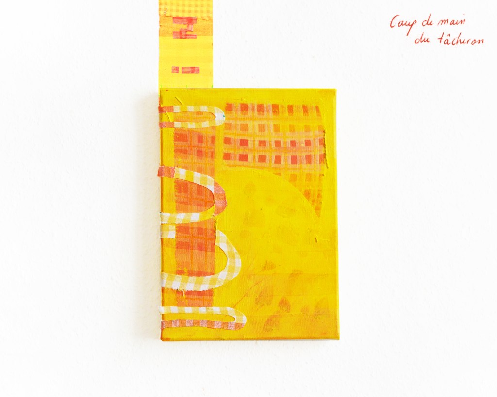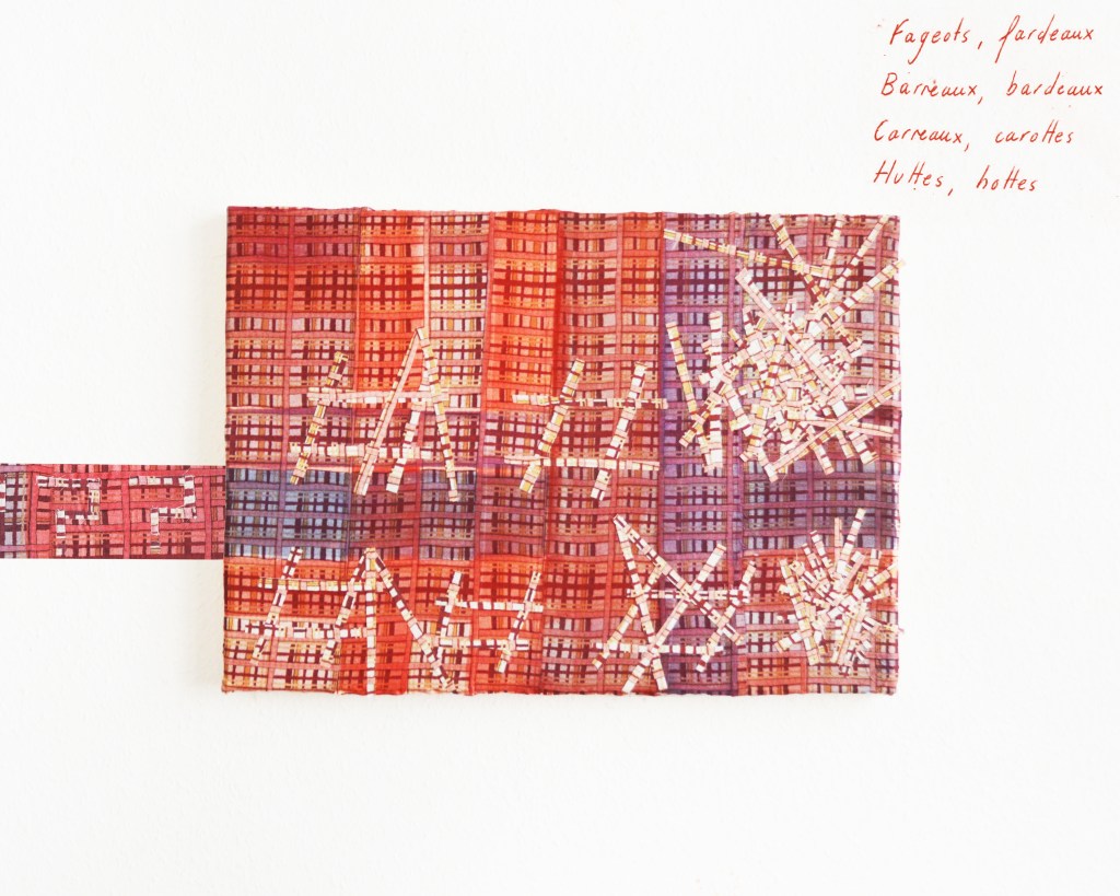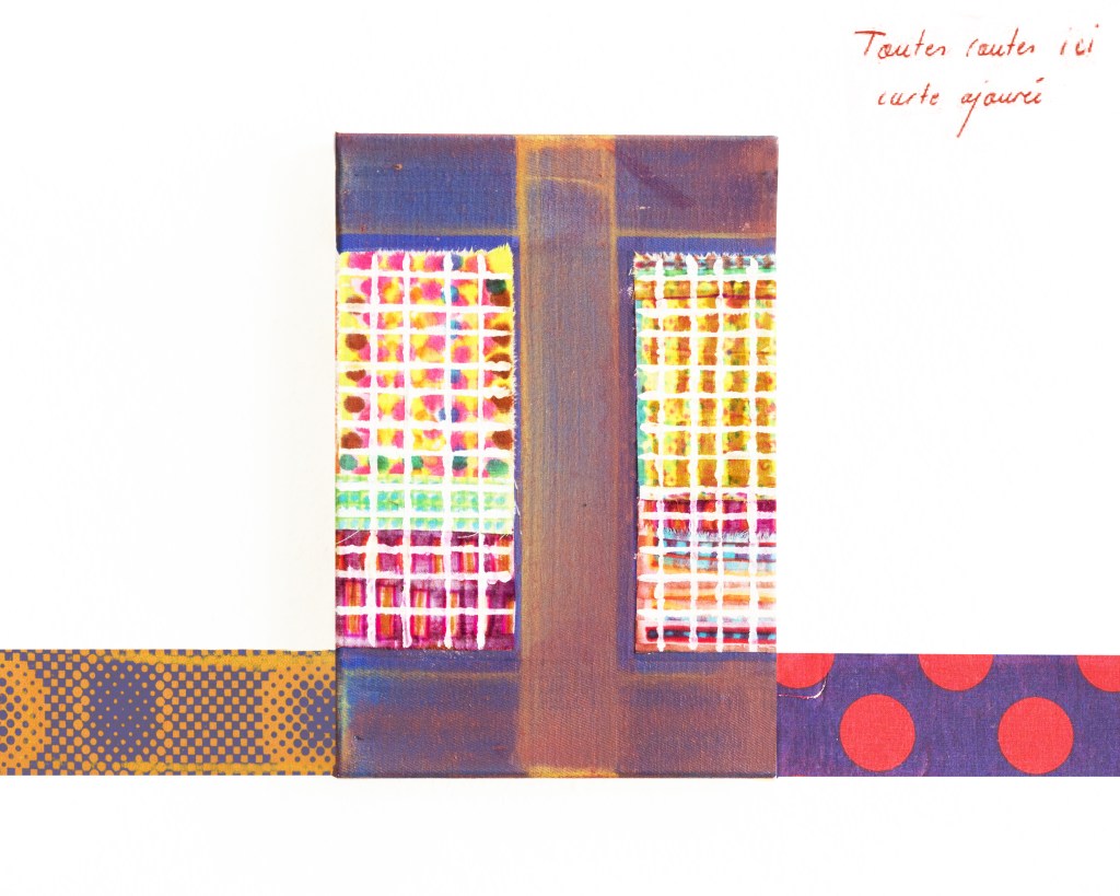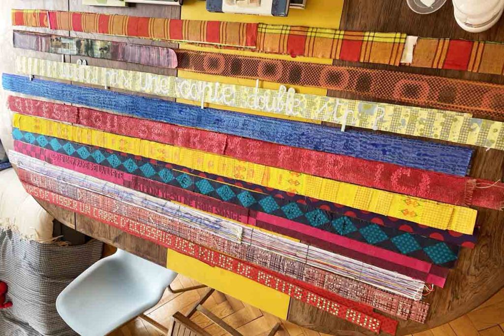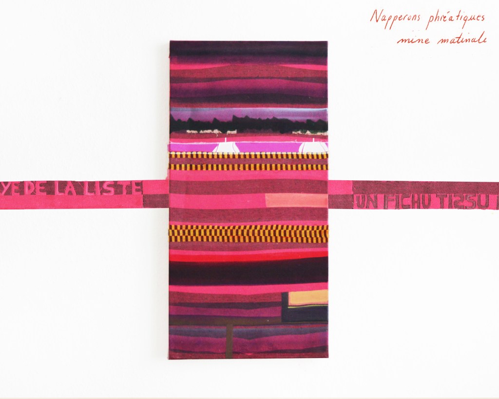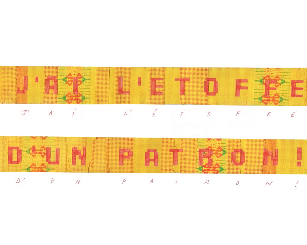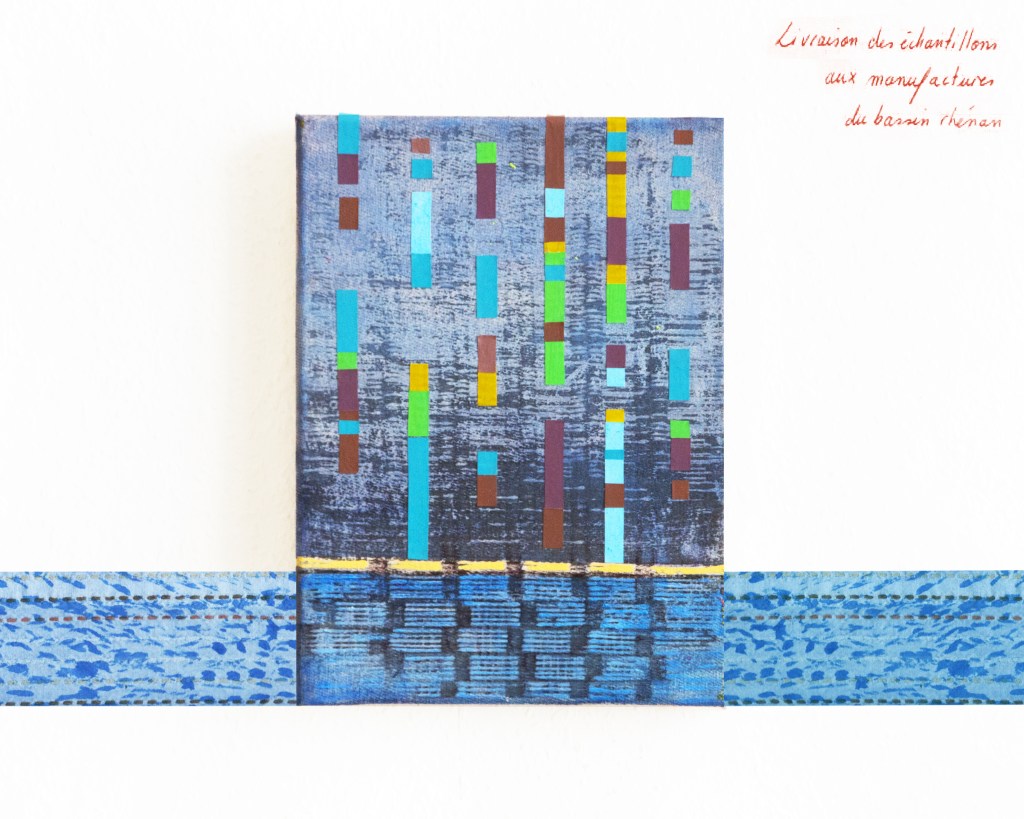 Partant de ces réflexions, j’ai essayé de matérialiser un dialogue spéculatif entre des entités abstraites (échantillons de motifs réinterprétés picturalement) dispersées dans l’espace, pour figurer leur éclatement tout en fabulant sur des possibilités de communication à distance, codées, échappant au contrôle de patrons imaginaires. Des bandes de toile peintes, pensées comme des phylactères, relient les échantillons et dévoilent des dialogues à double-sens, basés sur des jeux de mots en résonnance avec les champs lexicaux du textile et du travail. Ce sont des « doublures » : des voies de communication qui donnent voix aux doublures. Les échantillons textiles sont des textes-îles qui se croisent dans un réseau archipel in-situ, qui fait écho aux motifs à carreaux typiques du Val d’Argent (guingan, siamoise, écossais).