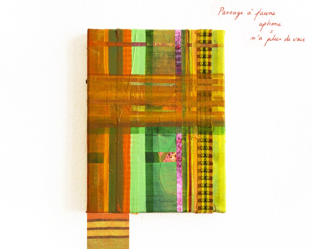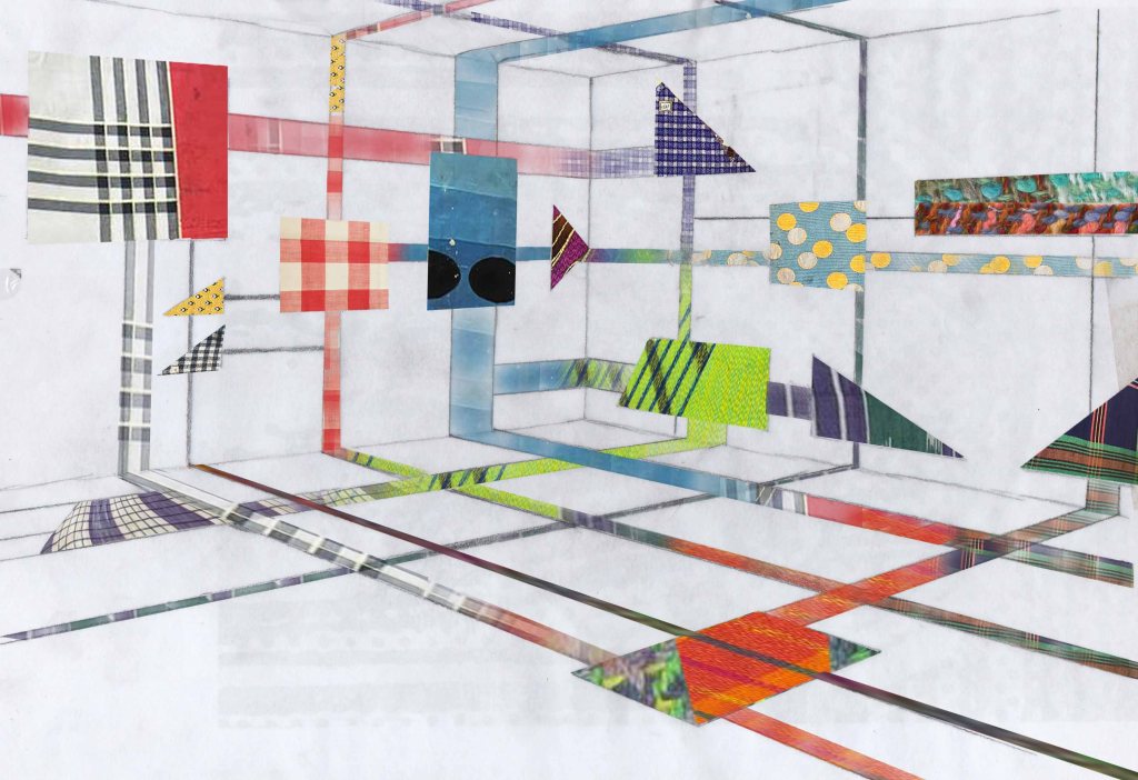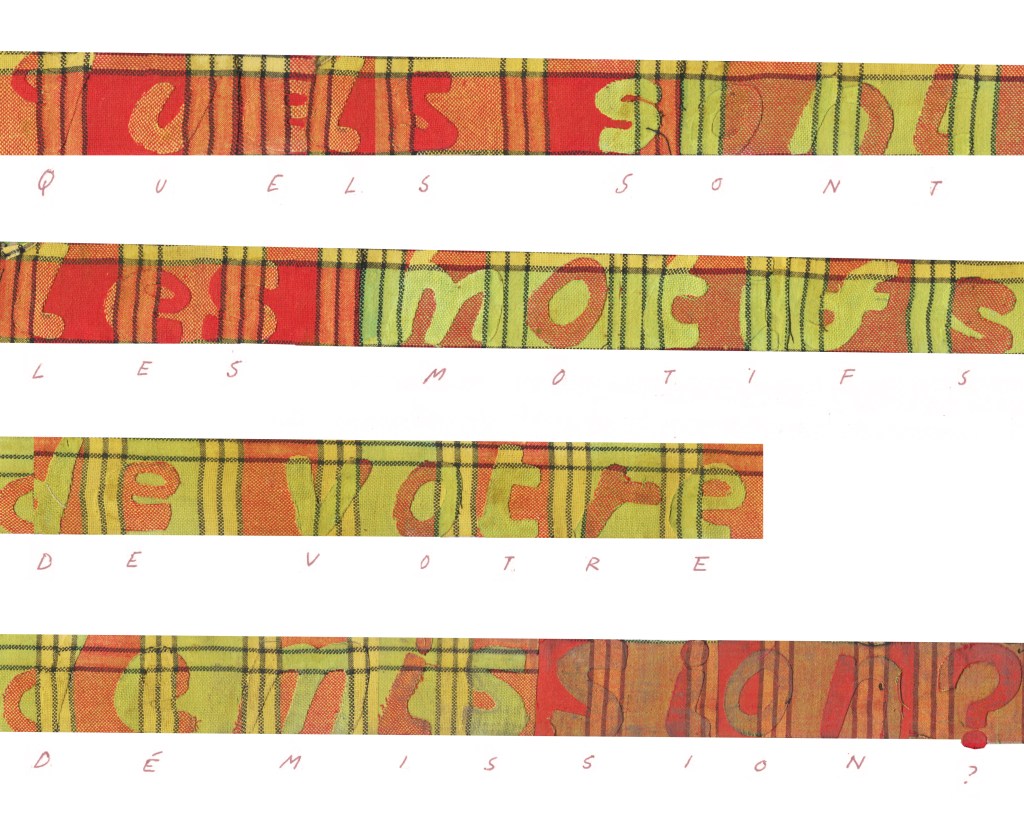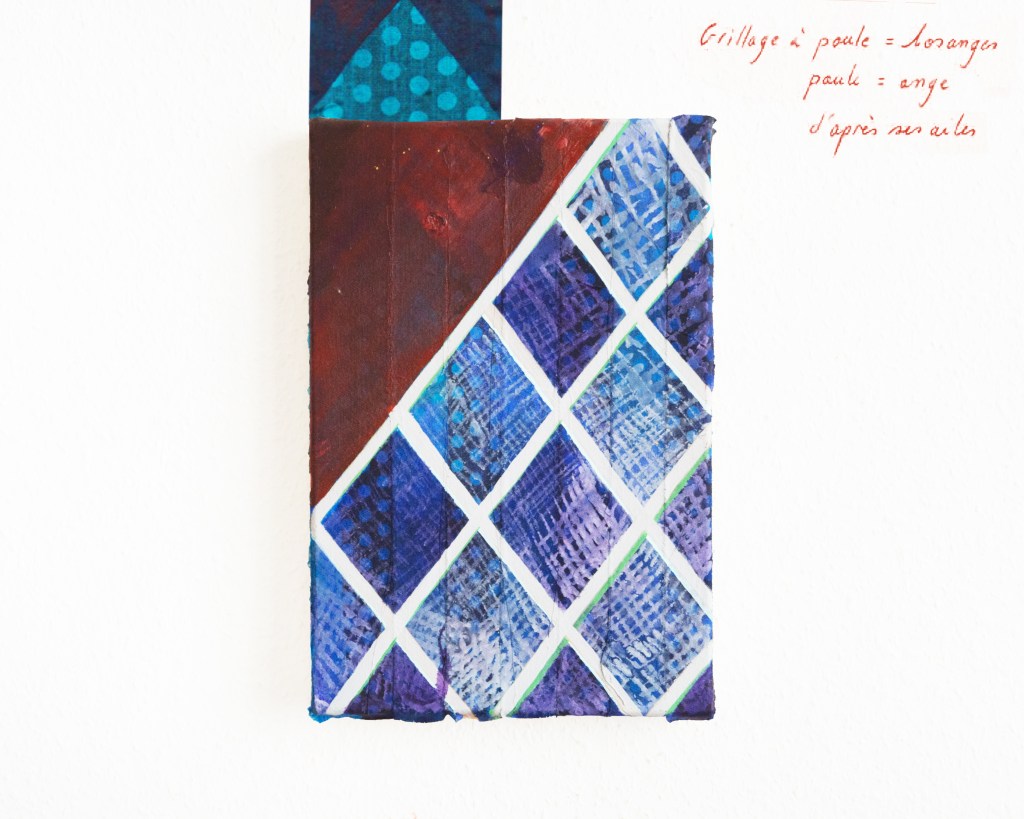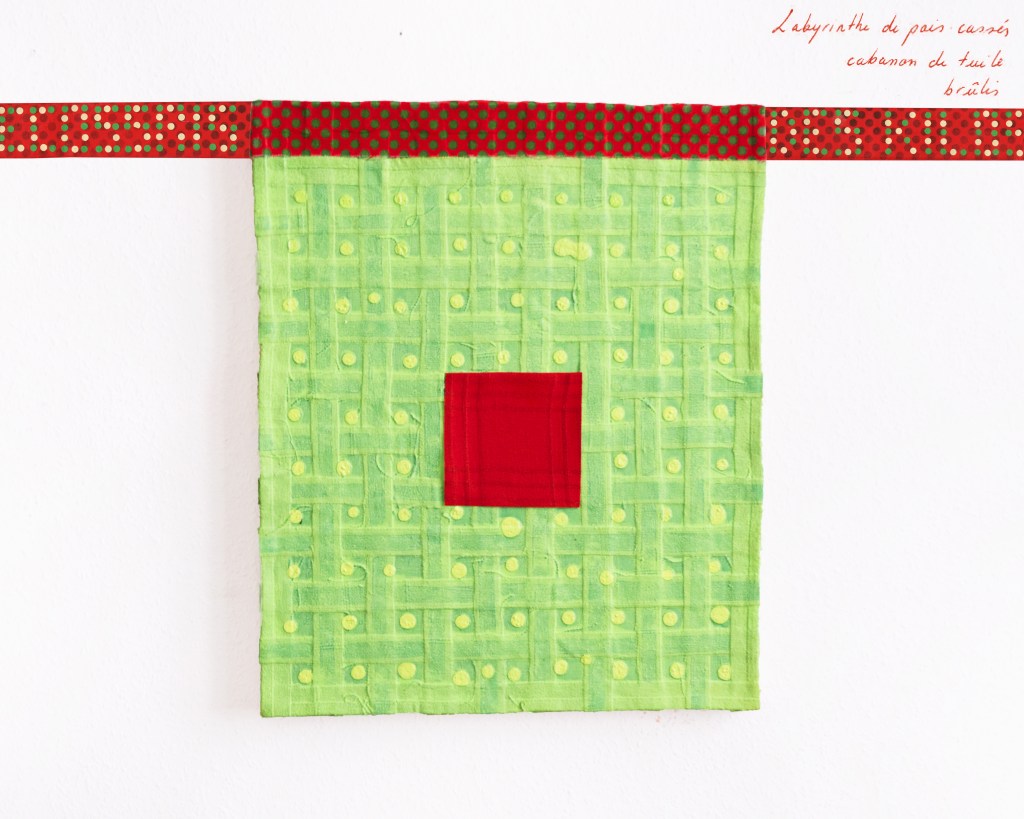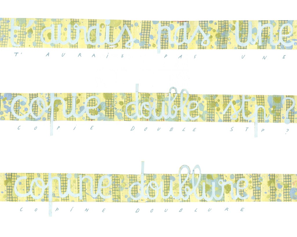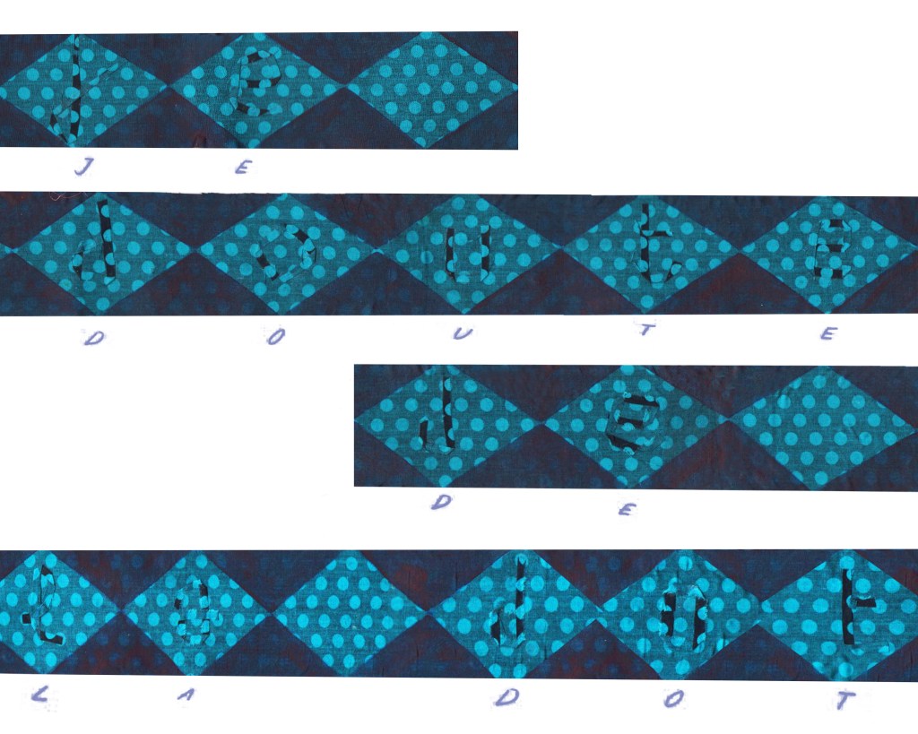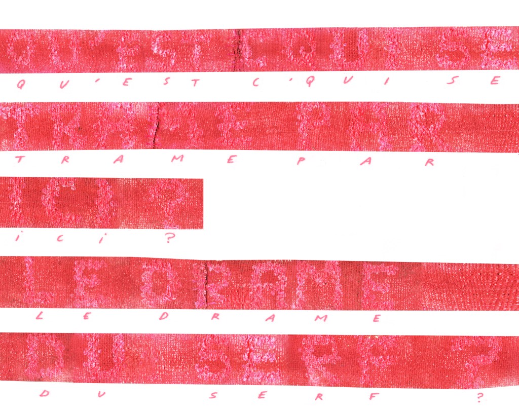 Partant de ces réflexions, j’ai essayé de matérialiser un dialogue spéculatif entre des entités abstraites (échantillons de motifs réinterprétés picturalement) dispersées dans l’espace, pour figurer leur éclatement tout en fabulant sur des possibilités de communication à distance, codées, échappant au contrôle de patrons imaginaires. Des bandes de toile peintes, pensées comme des phylactères, relient les échantillons et dévoilent des dialogues à double-sens, basés sur des jeux de mots en résonnance avec les champs lexicaux du textile et du travail. Ce sont des « doublures » : des voies de communication qui donnent voix aux doublures. Les échantillons textiles sont des textes-îles qui se croisent dans un réseau archipel in-situ, qui fait écho aux motifs à carreaux typiques du Val d’Argent (guingan, siamoise, écossais).