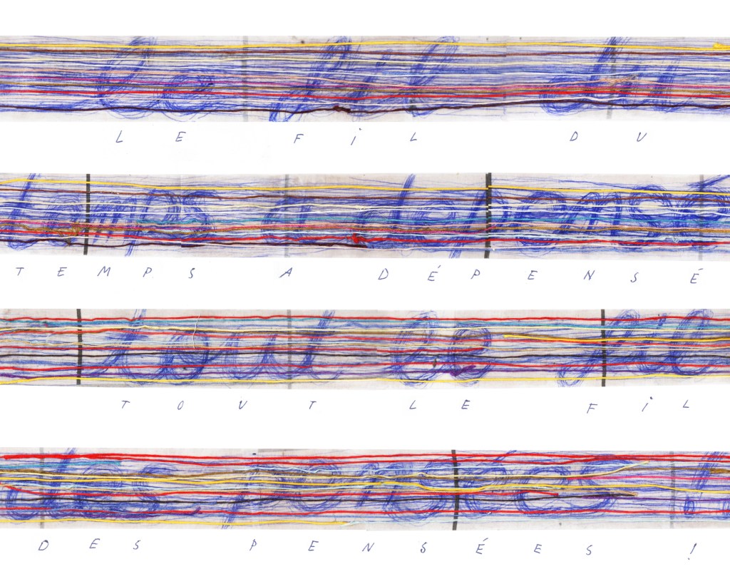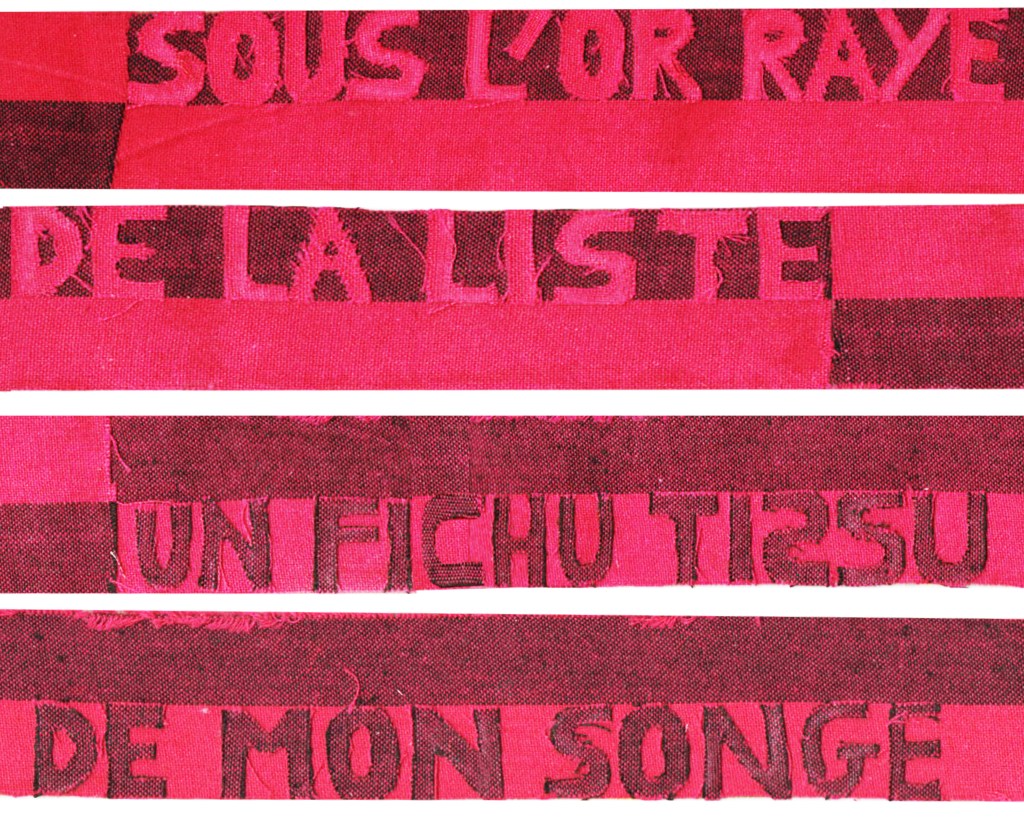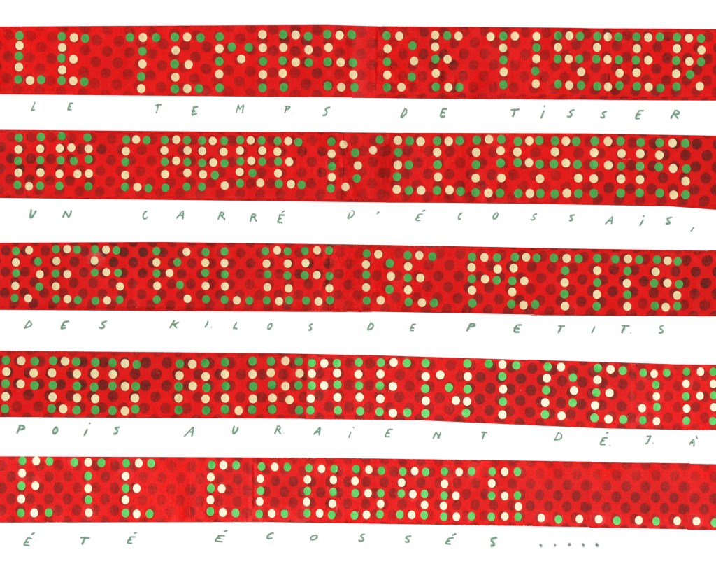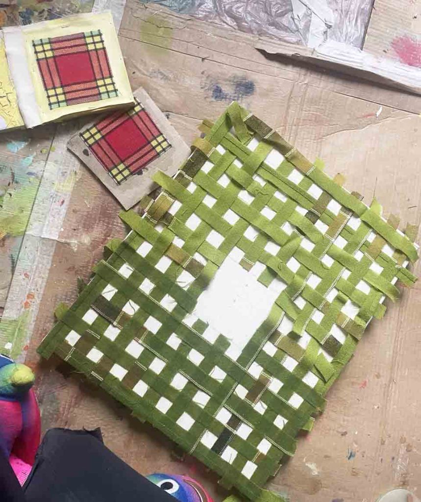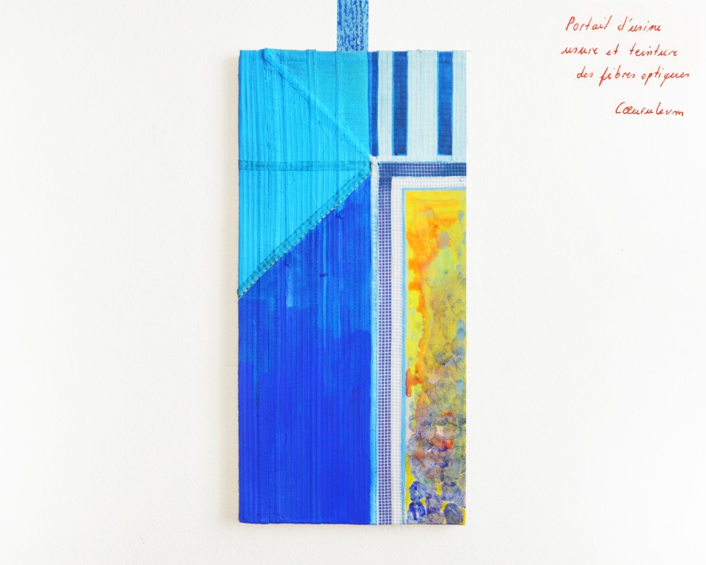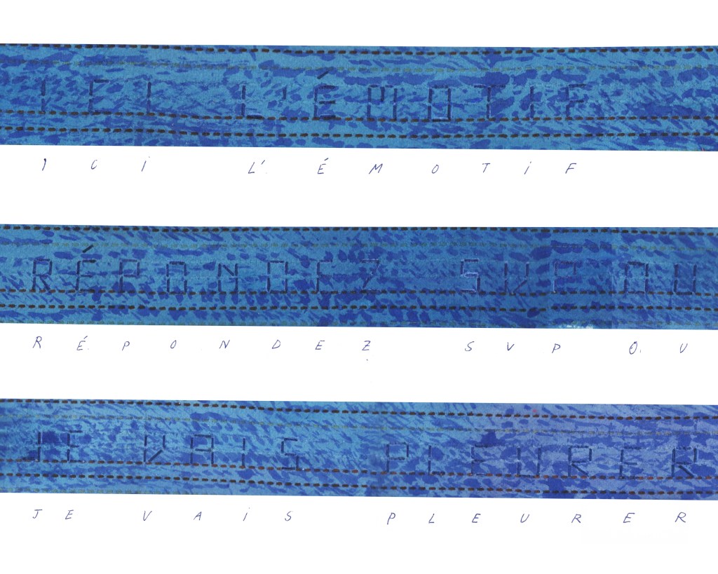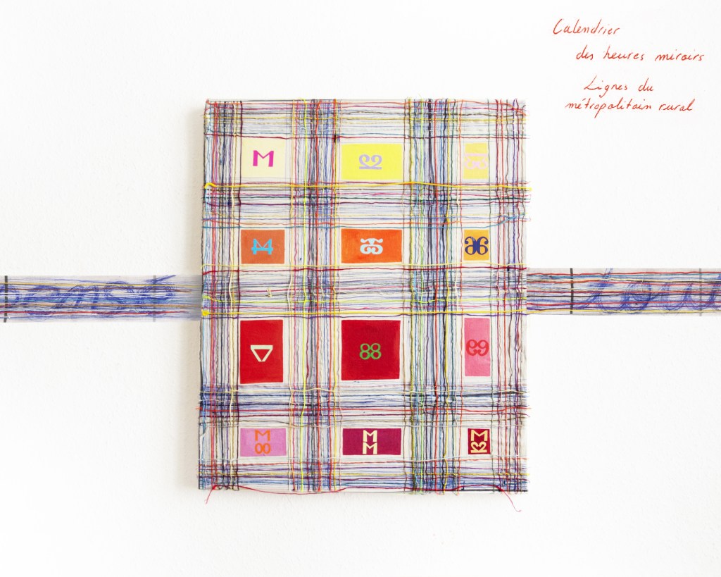 Partant de ces réflexions, j’ai essayé de matérialiser un dialogue spéculatif entre des entités abstraites (échantillons de motifs réinterprétés picturalement) dispersées dans l’espace, pour figurer leur éclatement tout en fabulant sur des possibilités de communication à distance, codées, échappant au contrôle de patrons imaginaires. Des bandes de toile peintes, pensées comme des phylactères, relient les échantillons et dévoilent des dialogues à double-sens, basés sur des jeux de mots en résonnance avec les champs lexicaux du textile et du travail. Ce sont des « doublures » : des voies de communication qui donnent voix aux doublures. Les échantillons textiles sont des textes-îles qui se croisent dans un réseau archipel in-situ, qui fait écho aux motifs à carreaux typiques du Val d’Argent (guingan, siamoise, écossais).