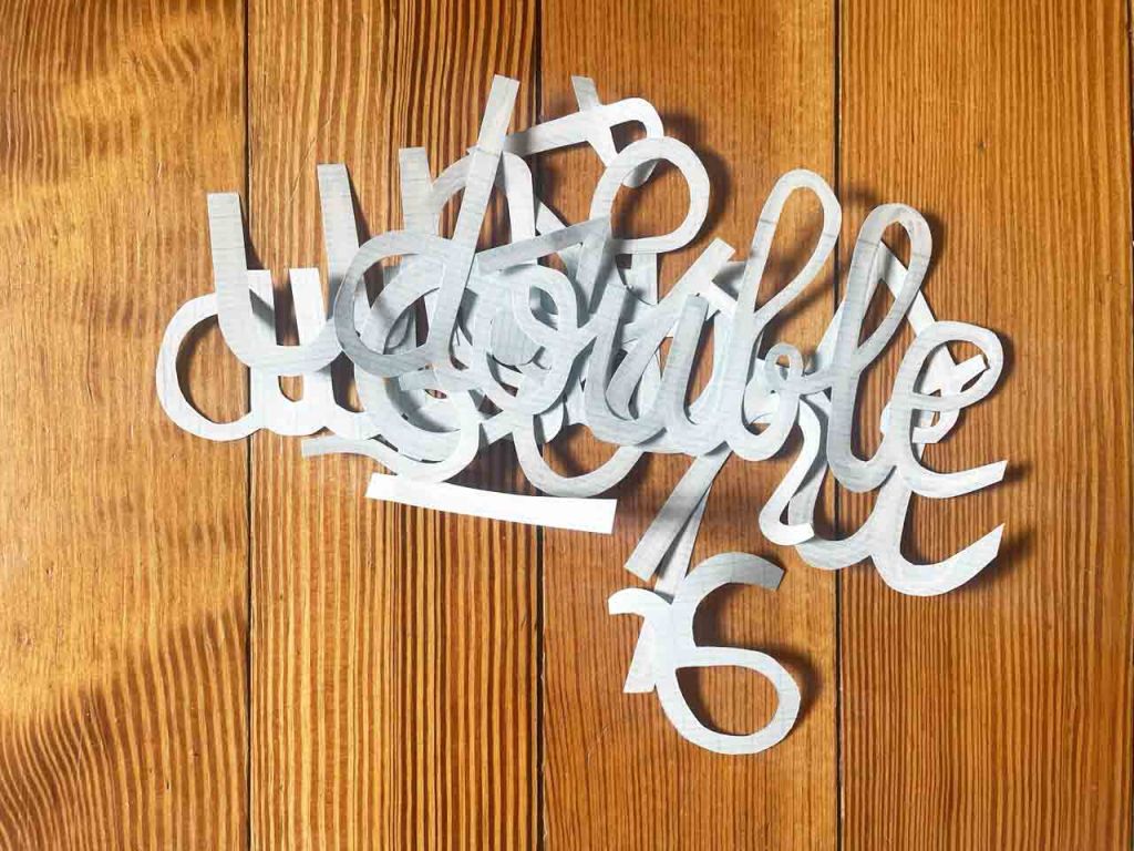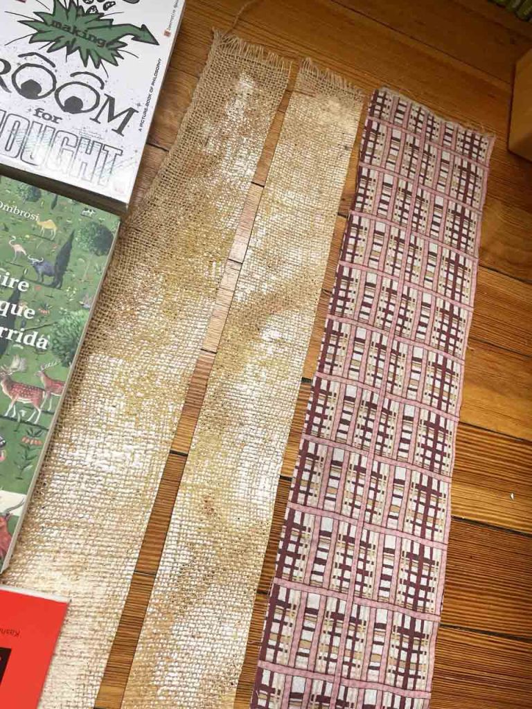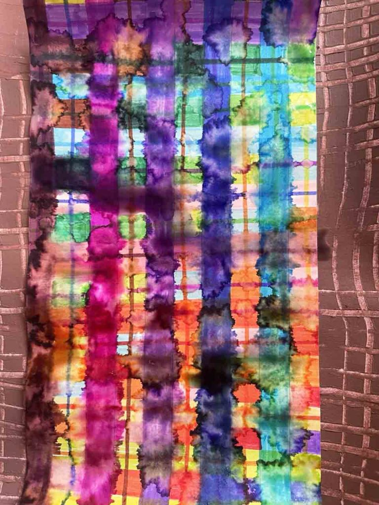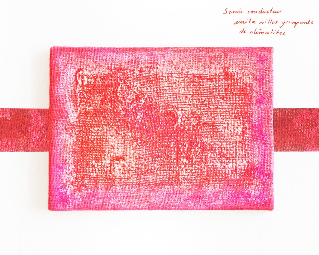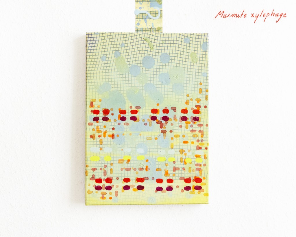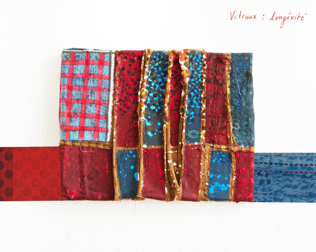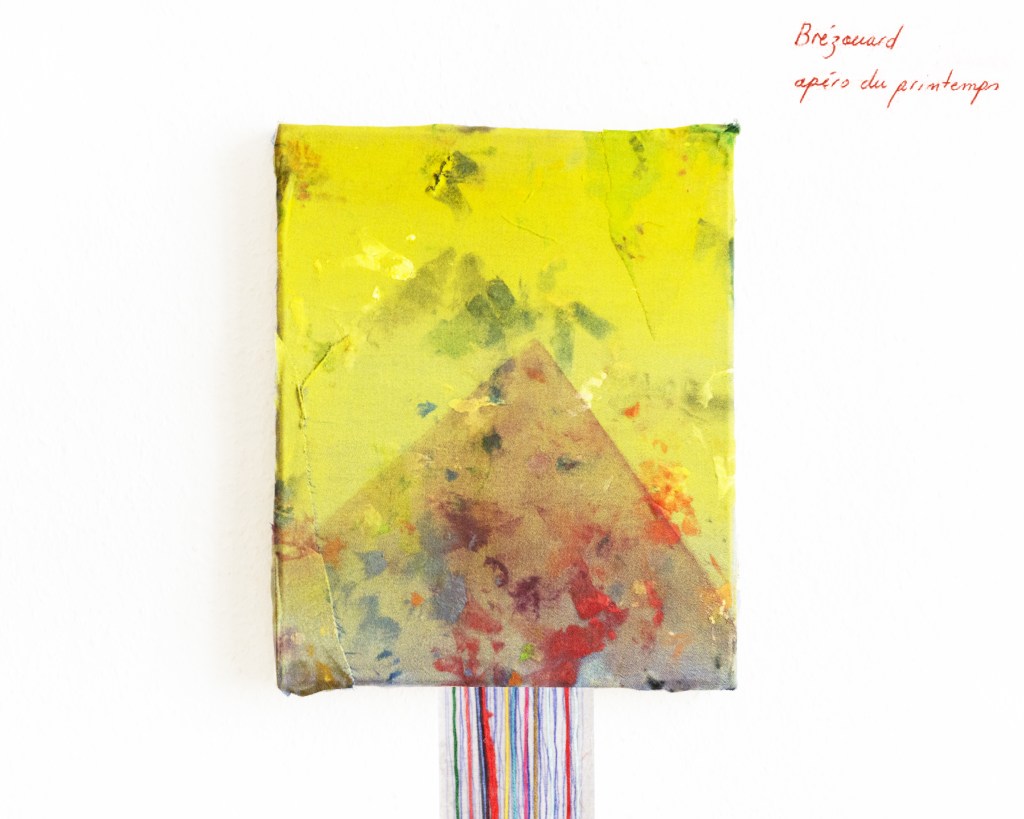 Partant de ces réflexions, j’ai essayé de matérialiser un dialogue spéculatif entre des entités abstraites (échantillons de motifs réinterprétés picturalement) dispersées dans l’espace, pour figurer leur éclatement tout en fabulant sur des possibilités de communication à distance, codées, échappant au contrôle de patrons imaginaires. Des bandes de toile peintes, pensées comme des phylactères, relient les échantillons et dévoilent des dialogues à double-sens, basés sur des jeux de mots en résonnance avec les champs lexicaux du textile et du travail. Ce sont des « doublures » : des voies de communication qui donnent voix aux doublures. Les échantillons textiles sont des textes-îles qui se croisent dans un réseau archipel in-situ, qui fait écho aux motifs à carreaux typiques du Val d’Argent (guingan, siamoise, écossais).