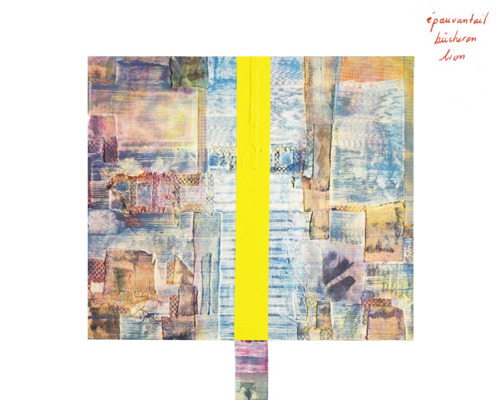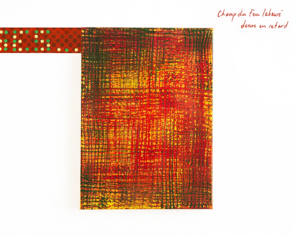 Doublure ★ Installation : série de 20 peintures à l’huile, tempera et collages sur toiles et textiles enchâssés & 20 bandes de toile libre peintes, contrecollées aux murs ★ In-situ, dimensions variables ★ 2025