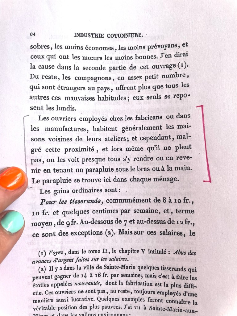 Sur ces textiles, les motifs en eux-mêmes cachaient parfois des messages graphiques codés. Par exemple, lors de l’occupation allemande en Alsace, certaines manufactures intégraient leur volonté d’indépendance dans des carreaux : les motifs écossais, appréciés de l’administration allemande, cachaient des rayures aux couleurs du drapeau français. Jusqu’au XIXè siècle, avant l’avènement de la révolution industrielle occidentale, l’industrie textile du Val d’Argent reposait sur un mode de production à main-d’oeuvre décentralisée, avec une dispersion des unités de production. Les paysan·nes, souvent tisserand·es à domicile, complétaient leur revenu principal par leurs activités de filage et de tissage. Avec une telle organisation répartie sur le territoire, les patrons des manufactures centrales réduisaient leurs coûts de fonctionnement et limitaient surtout les risques de mouvements sociaux. Ces paysan·nes souvent isolé·es géographiquement n’avaient pas les conditions propices pour communiquer, échanger sur leur situation, s’organiser collectivement pour revendiquer leurs droits. Ce cas met en lumière comment l’organisation spatiale et sociale des modes de production façonne les dynamiques de luttes et j’y trouve un écho avec l’industrie textile actuelle où la fragmentation des chaînes d’approvisionnement et l’éloignement des donneurs d’ordres maintiennent des mécanismes d’exploitation, privant les travailleur·euse·s précaires de pouvoir et de prise de parole.