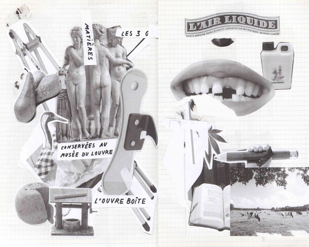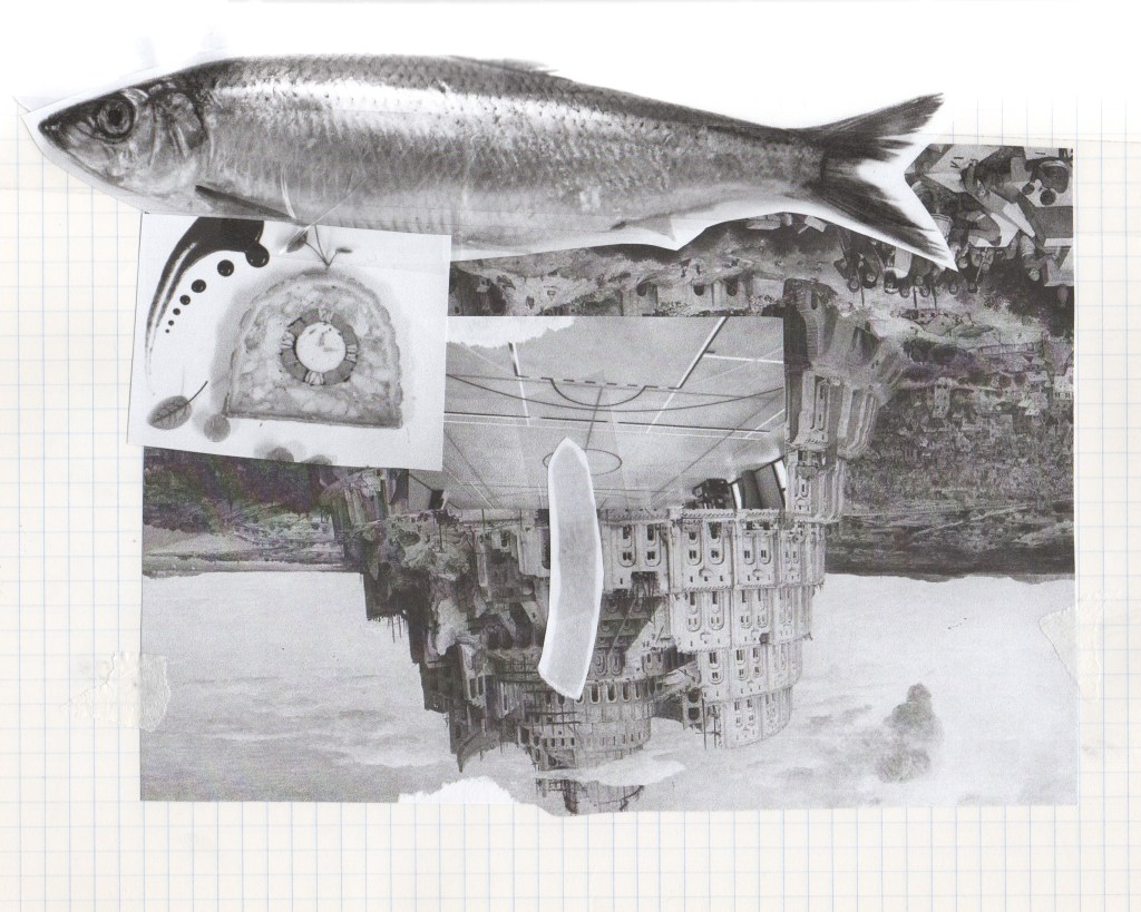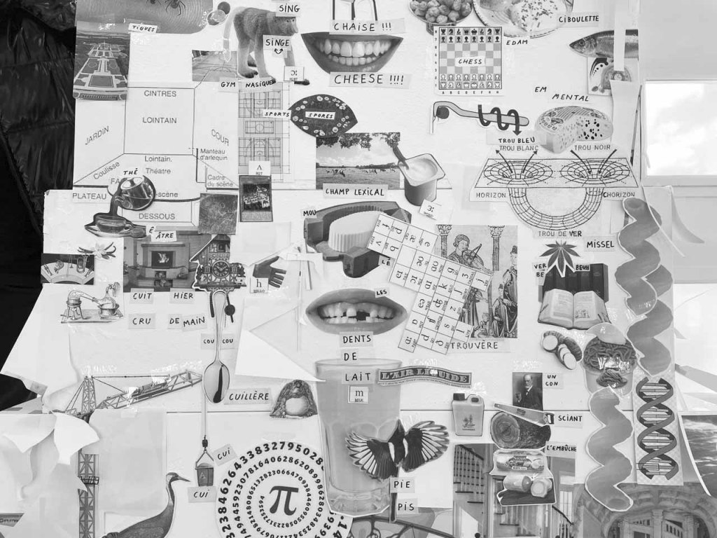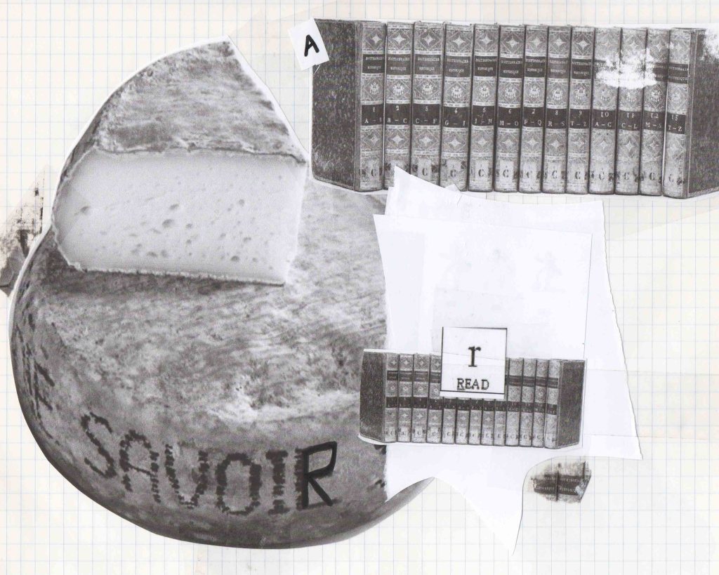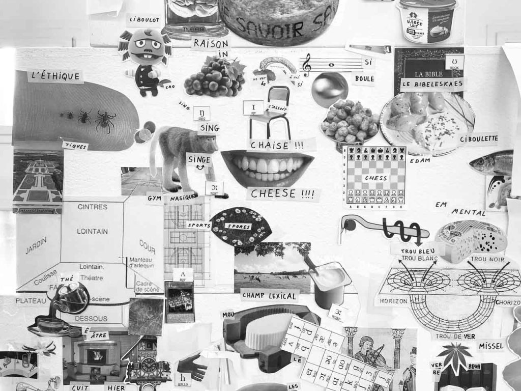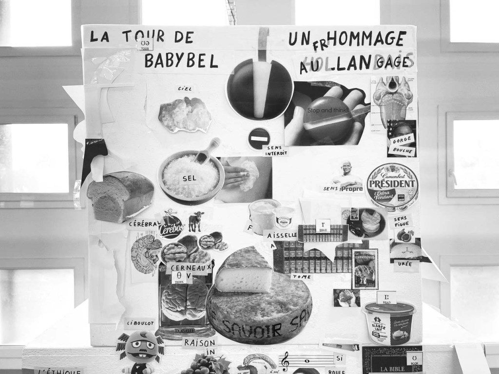 J’ai fait des vidéos de fantômes luminaires, puis un test pour une future Tour de Babybel (fromage au langage), car nous étions en terre de camembert. Cette tour témoigne de la construction du langage sur des analogies fromagères, laitage par laitage. Le fromage est un aliment fermenté et le langage sait faire mentir. Il est aussi question de fan de tomme ! Ce que j’ai le plus aimé dans ces recherches, c’étaient les collages aléatoires qui sont apparus dans mon cahier lors de la destruction de la Tour de Babybel. Peut-être que sa destinée est d’être des truites. Mais je ne connais pas de plats qui associent poisson et fromage…