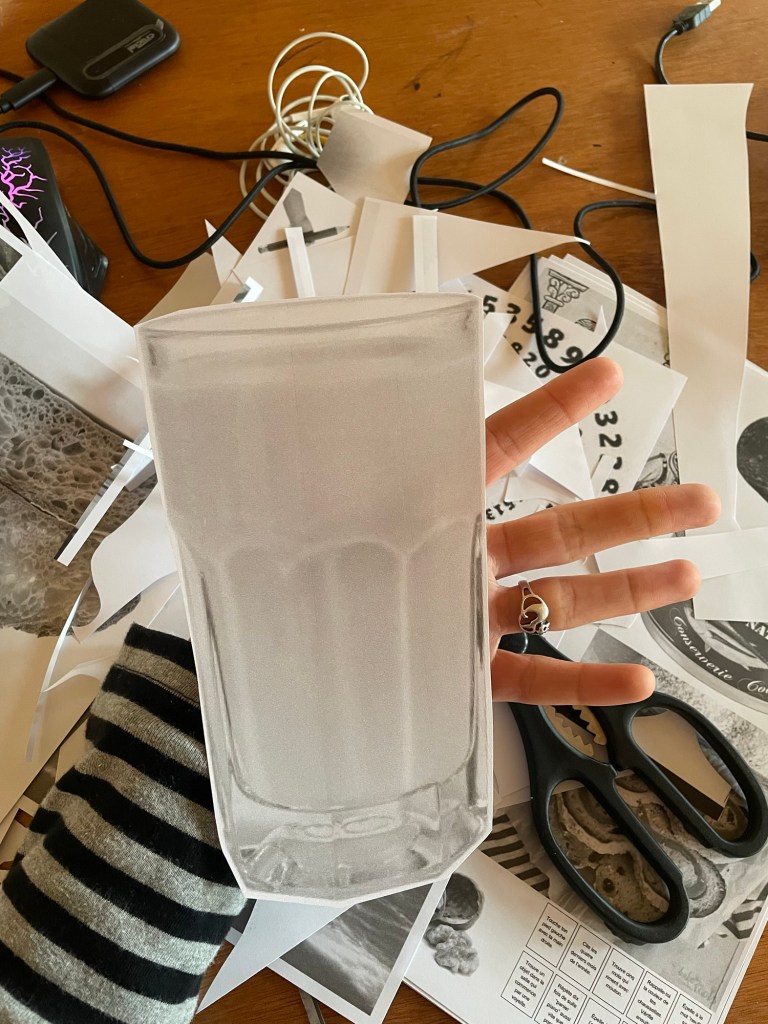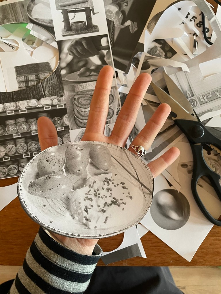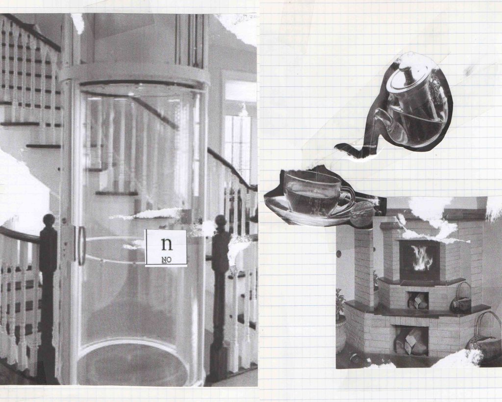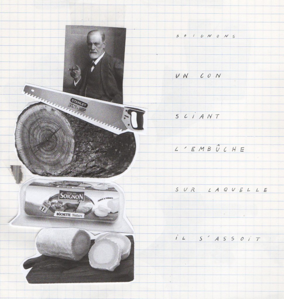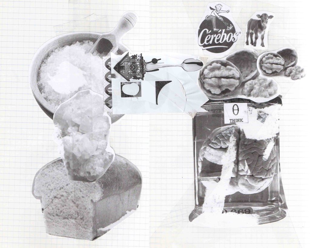 J’ai fait des vidéos de fantômes luminaires, puis un test pour une future Tour de Babybel (fromage au langage), car nous étions en terre de camembert. Cette tour témoigne de la construction du langage sur des analogies fromagères, laitage par laitage. Le fromage est un aliment fermenté et le langage sait faire mentir. Il est aussi question de fan de tomme ! Ce que j’ai le plus aimé dans ces recherches, c’étaient les collages aléatoires qui sont apparus dans mon cahier lors de la destruction de la Tour de Babybel. Peut-être que sa destinée est d’être des truites. Mais je ne connais pas de plats qui associent poisson et fromage…
