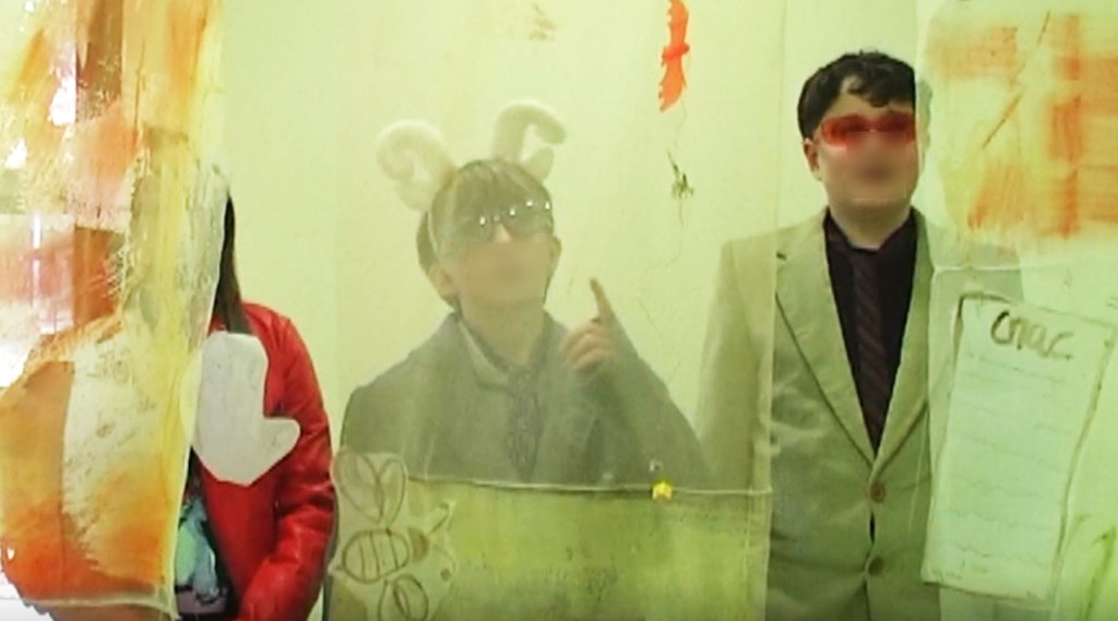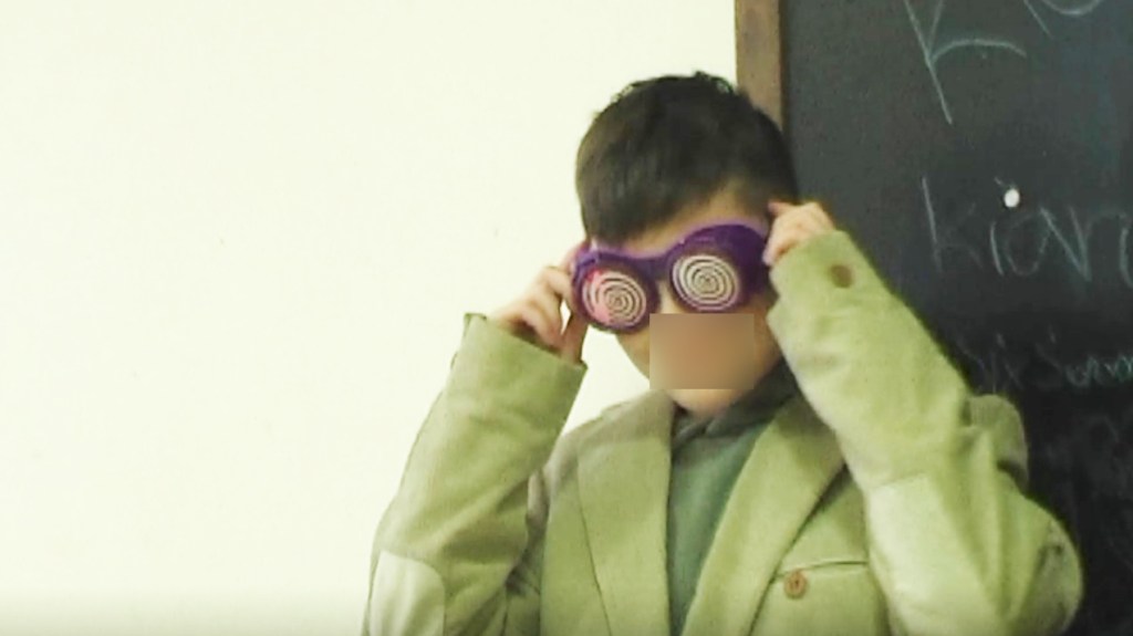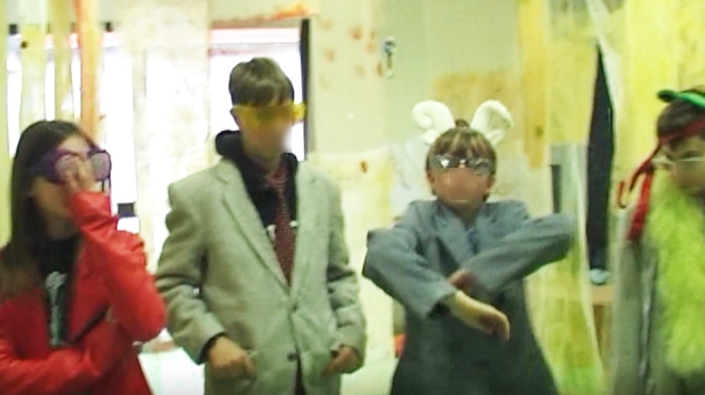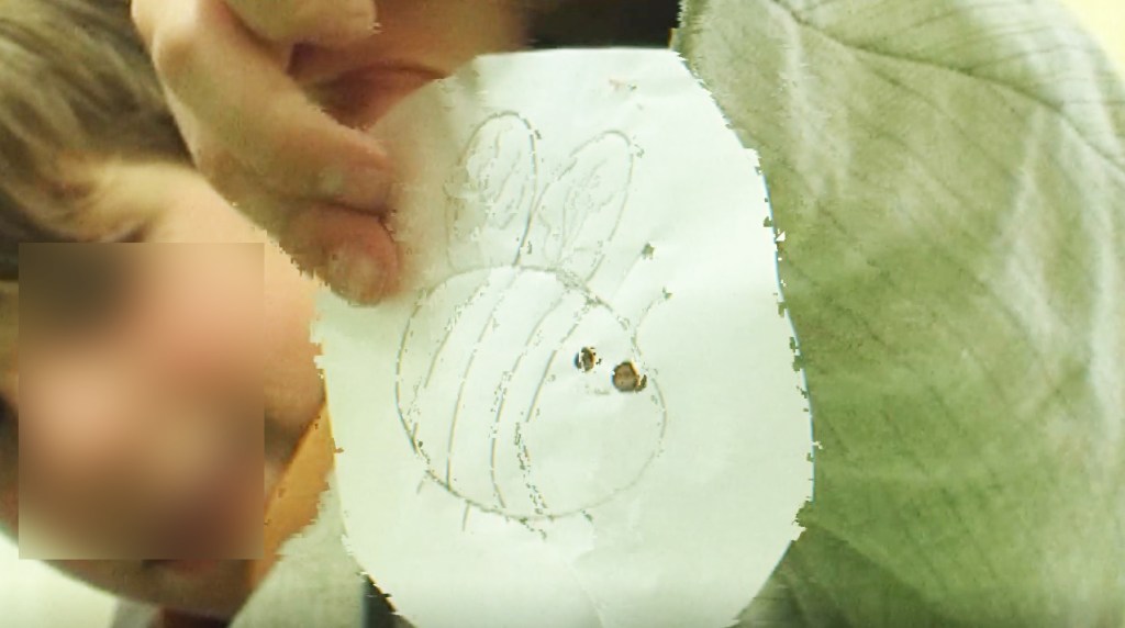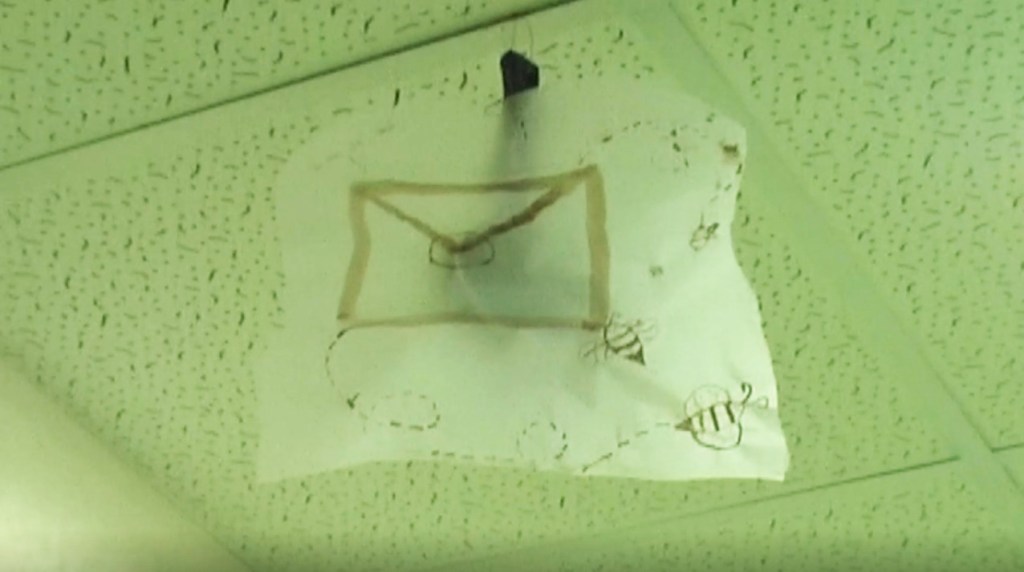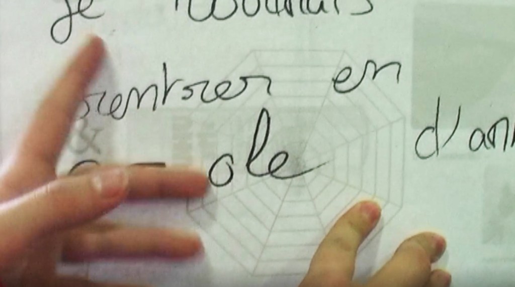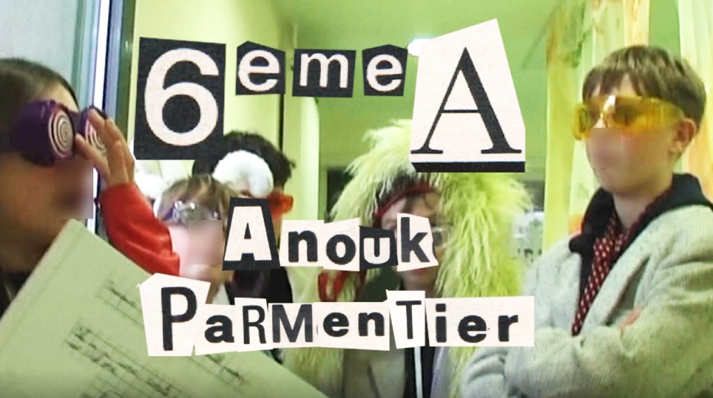 Photogrammes de la vidéo de la conférence-performance science-fiction à propos de L’enquête des abeilles messagères ★ caméra, acting, bruitages, réalisation par les 6èmes A au Collège de la Largue, montage par Anouk.P à Strasbourg ★ 5″ ★ filmée sur K-7 mini-DV ★ montrée au CRAC du 13 au 15 fèv. 2026