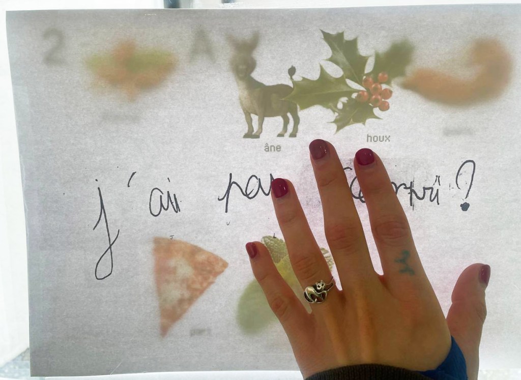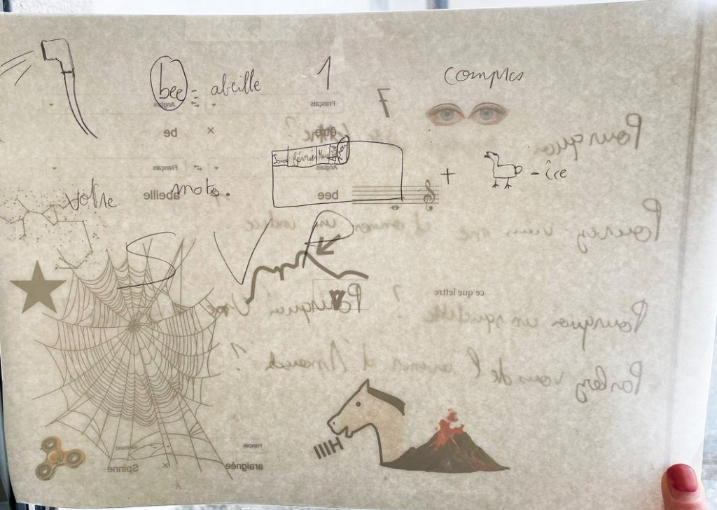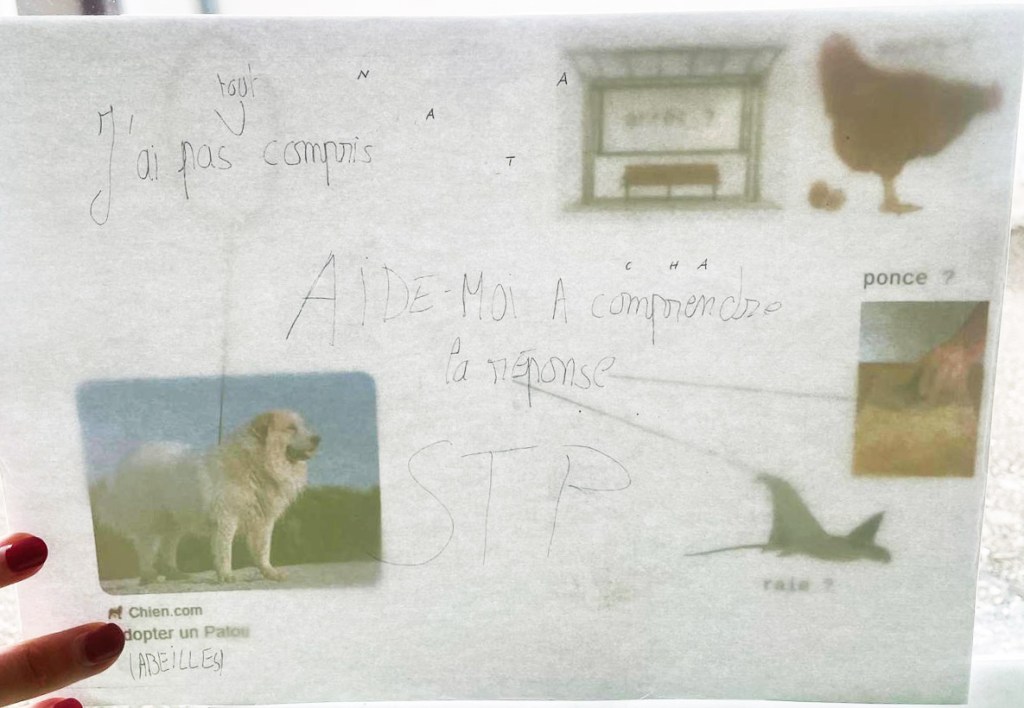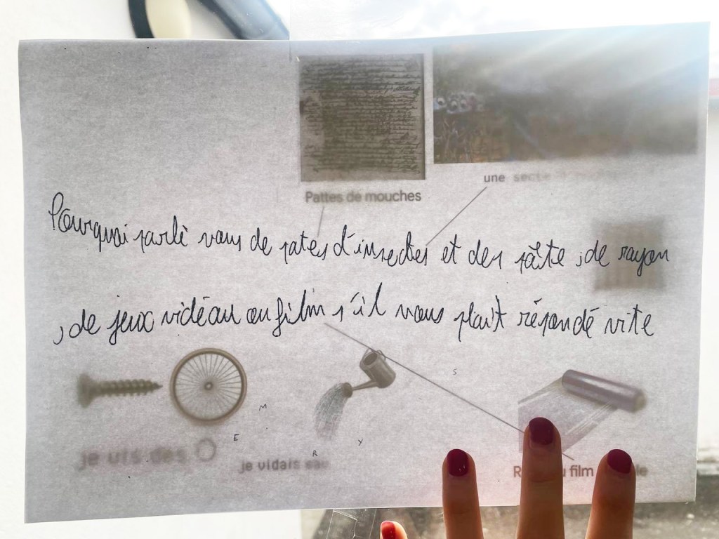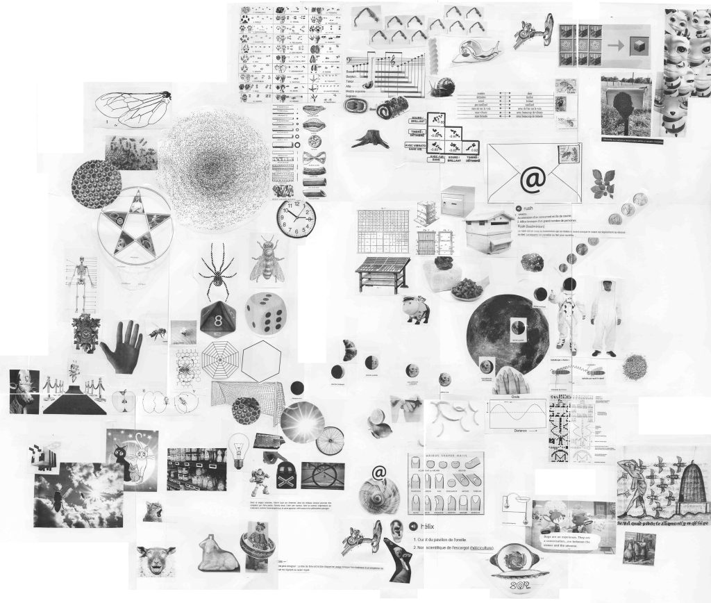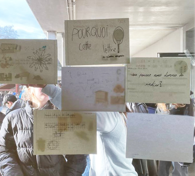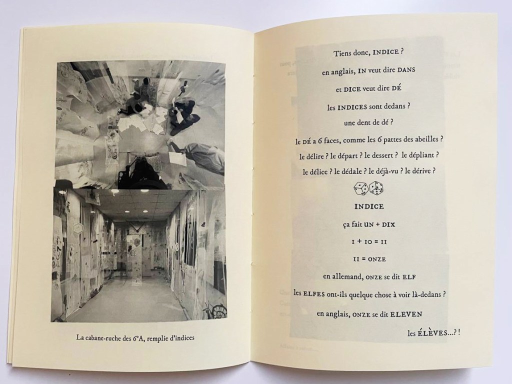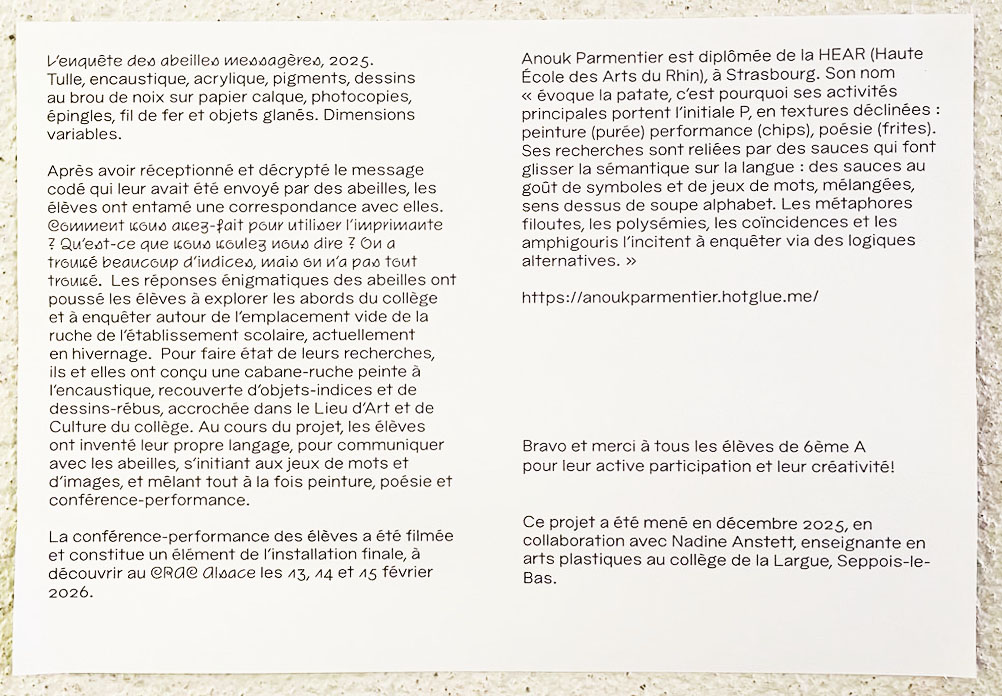 Après avoir réceptionné et décrypté le message codé qui leur avait été envoyé par des abeilles, les élèves ont entamé une correspondance avec elles: Qu’est-ce que vous voulez nous dire? Comment vous avez-fait pour utiliser l’imprimante? Les réponses énigmatiques des abeilles ont poussé les élèves à explorer les abords du collège et à enquêter autour de l’emplacement vide de la ruche de l’établissement scolaire, actuellement en hivernage. Pour faire état de leurs recherches, ils et elles ont conçu une cabane-ruche peinte à l’encaustique, recouverte d’objets-indices et de dessins-rébus, accrochée dans le Lieu d’Art et de Culture du collège. Au cours du projet, les élèves ont inventé leur propre langage, pour communiquer avec les abeilles, s’initiant aux jeux de mots et d’images, et mêlant tout à la fois peinture, poésie et conférence-performance.