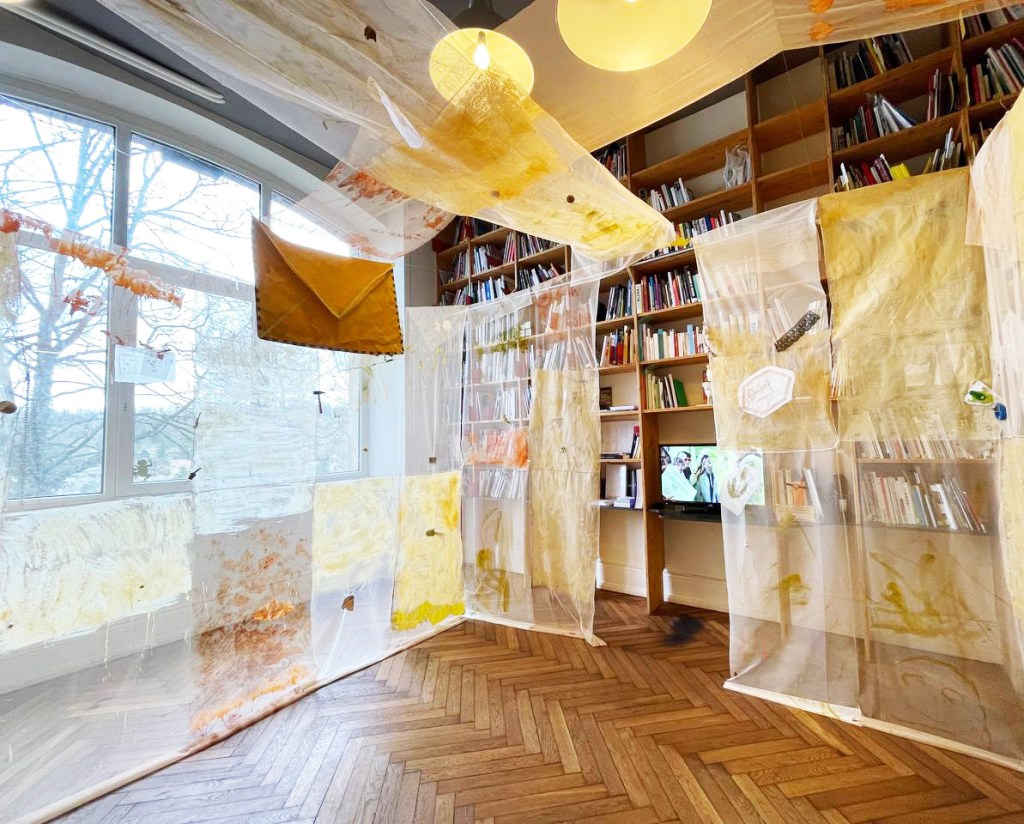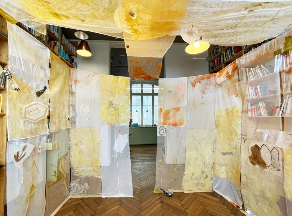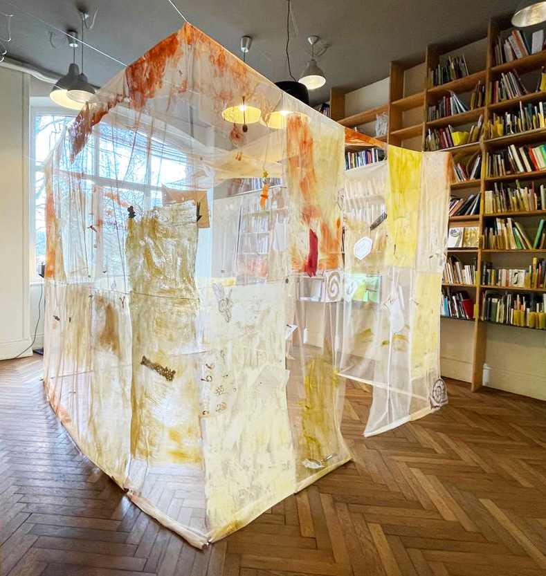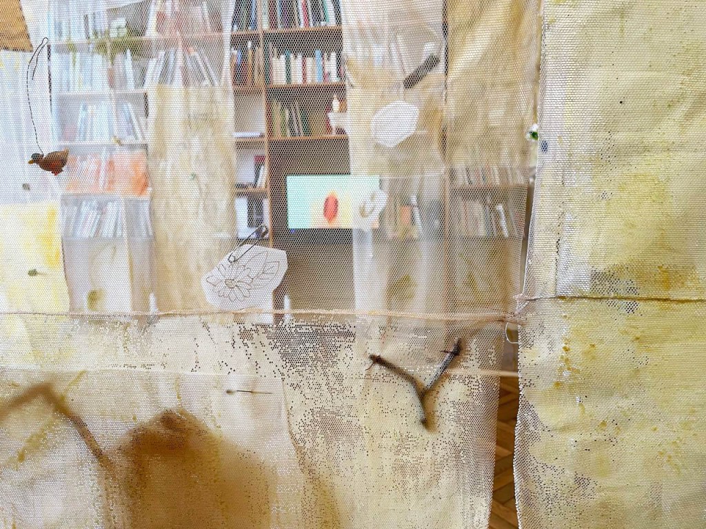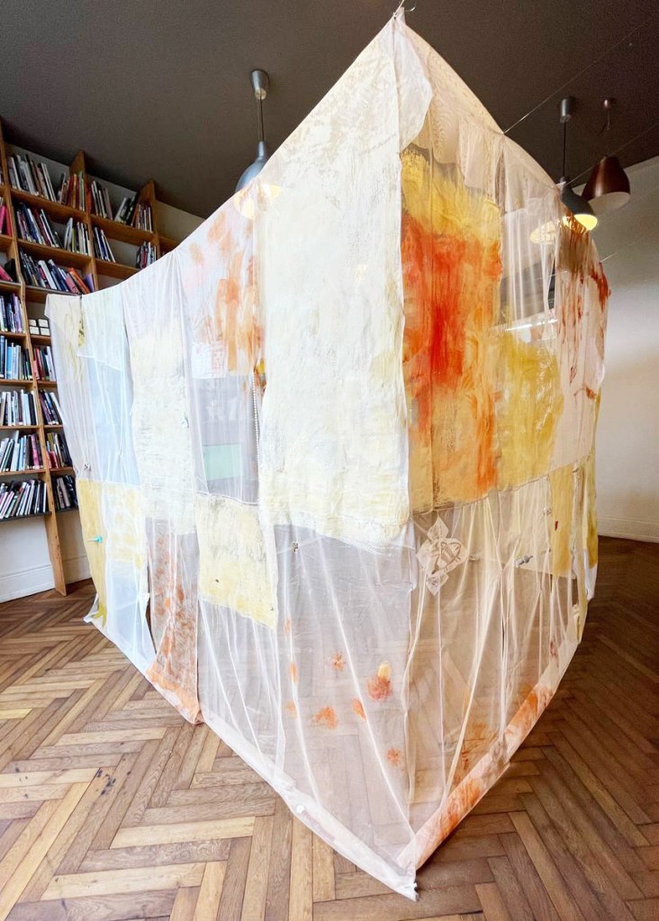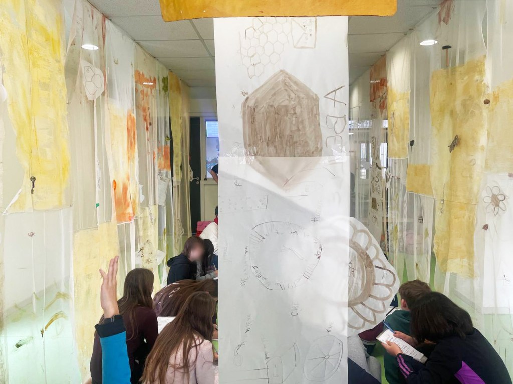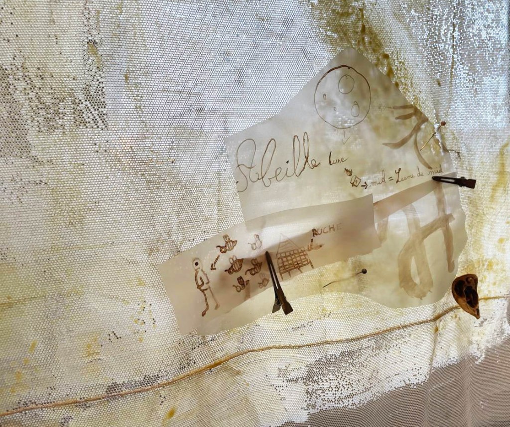 Cabane-ruche ★ Installation réalisée en co-création avec les 6èmes A ★ tulle, encaustique à la cire d’abeille et ocres, objets glanés, dessins au broux de noix sur papier calque, épingles, fil de cuivre, photocopies ★ dimensions variables ★ en décembre 2025-janvier 2026 : installée au LAC du Collège de la Largue / du 13 au 15 février 2026 : installée au CRAC Alsace avec la vidéo conférence-performance science-fiction sur L’enquête des abeilles messagères