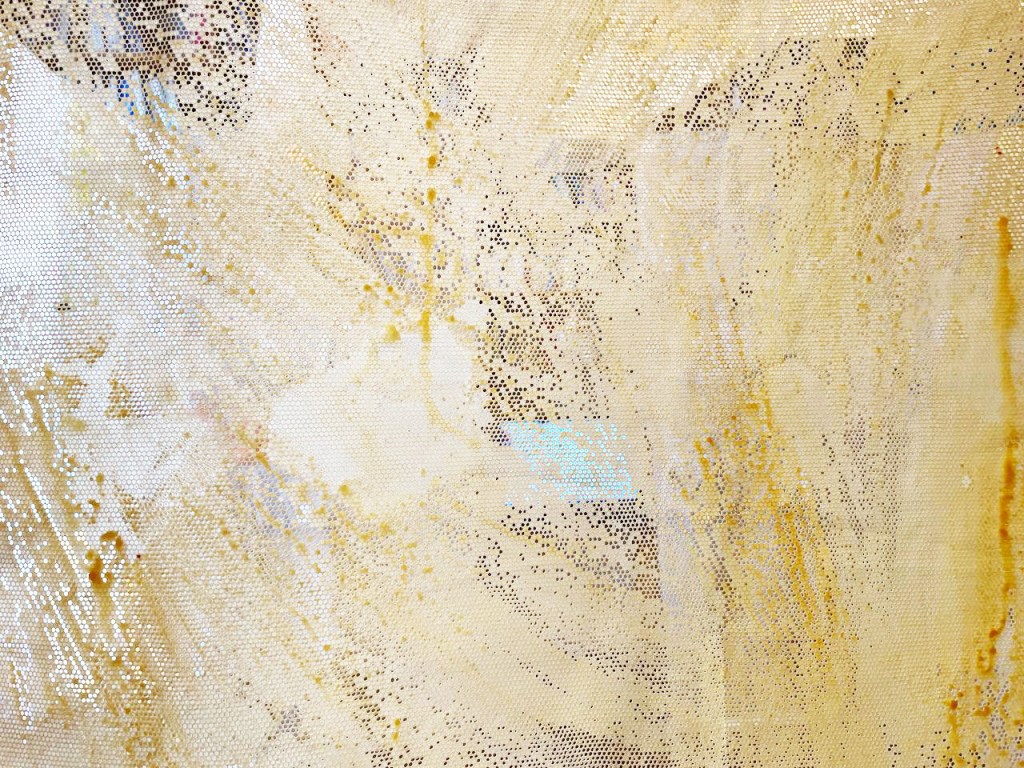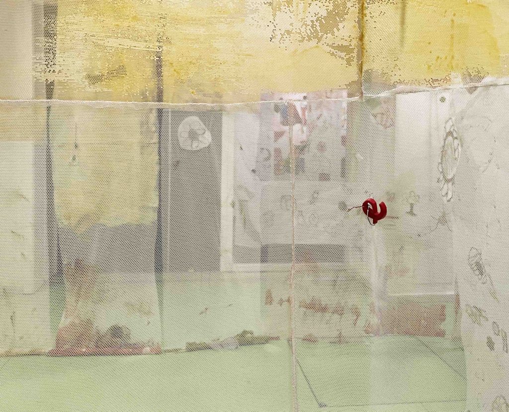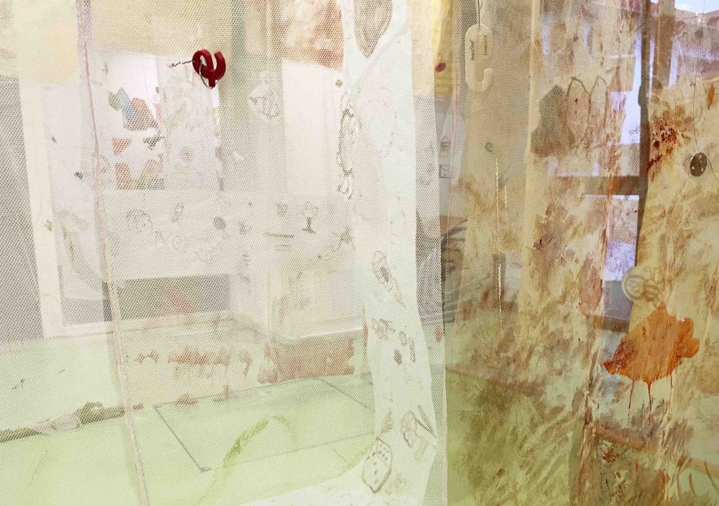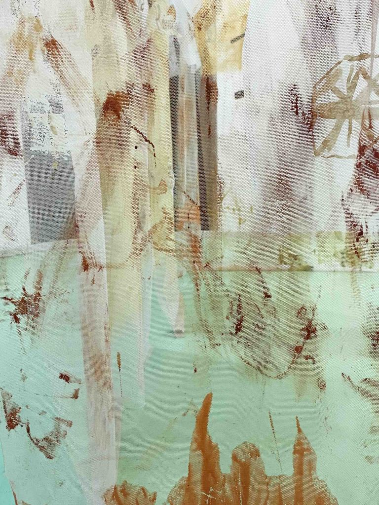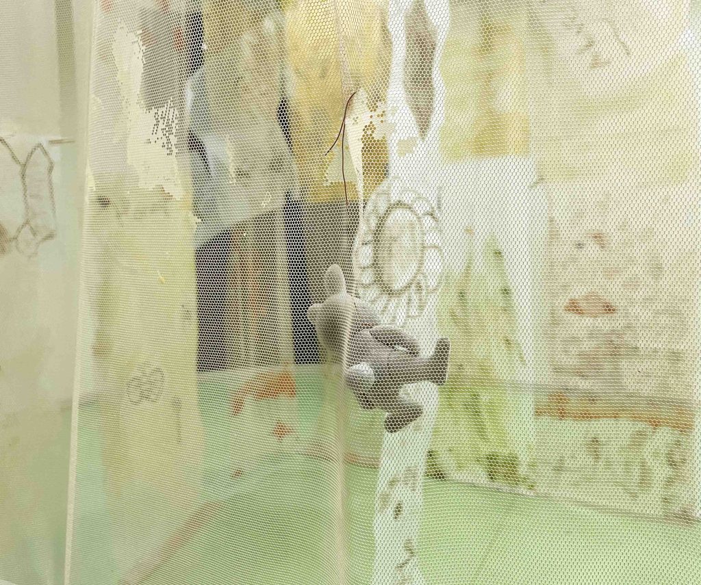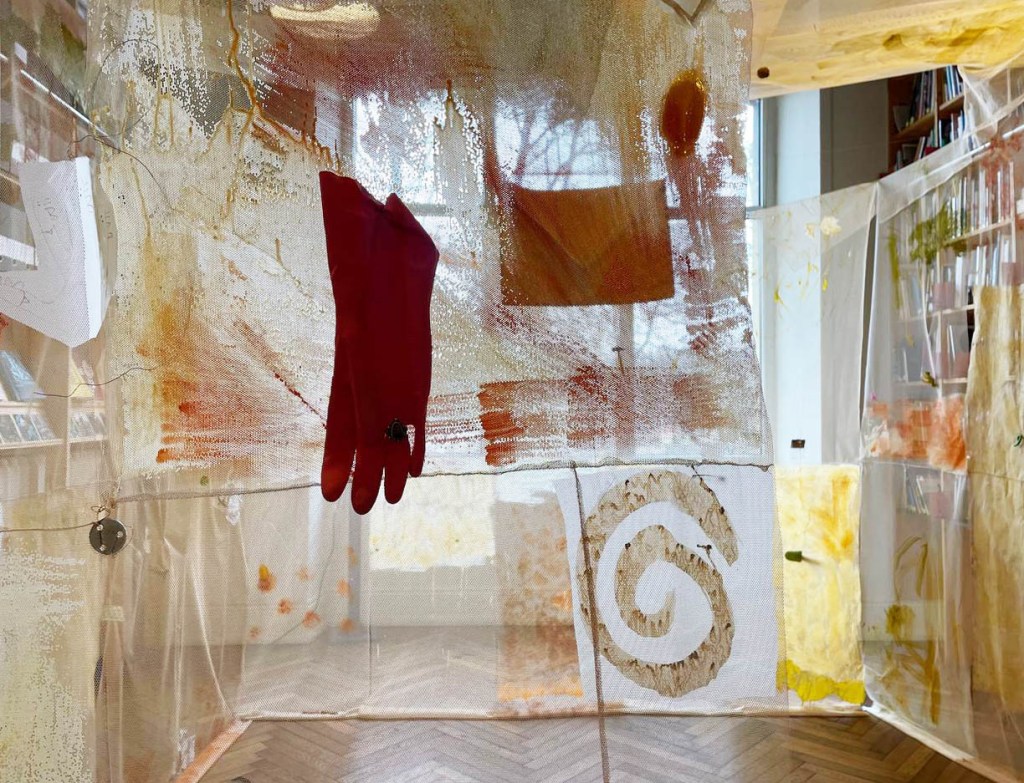 Cabane-ruche ★ Installation réalisée en co-création avec les 6èmes A ★ tulle, encaustique à la cire d’abeille et ocres, objets glanés, dessins au broux de noix sur papier calque, épingles, fil de cuivre, photocopies ★ dimensions variables ★ en décembre 2025-janvier 2026 : installée au LAC du Collège de la Largue / du 13 au 15 février 2026 : installée au CRAC Alsace avec la vidéo conférence-performance science-fiction sur L’enquête des abeilles messagères