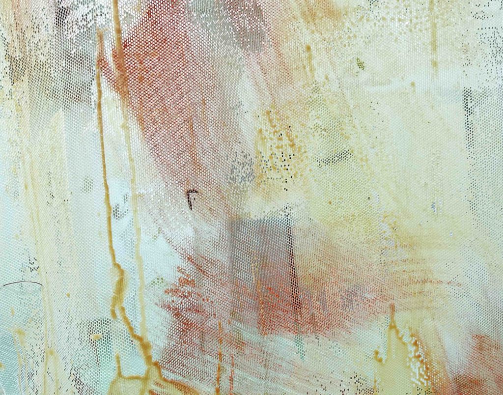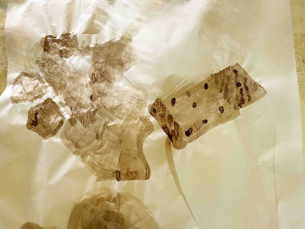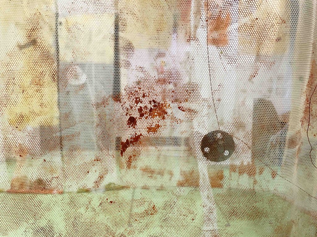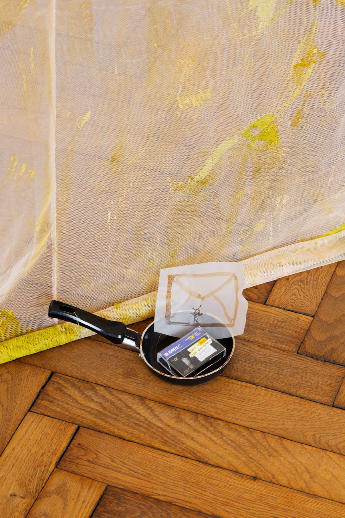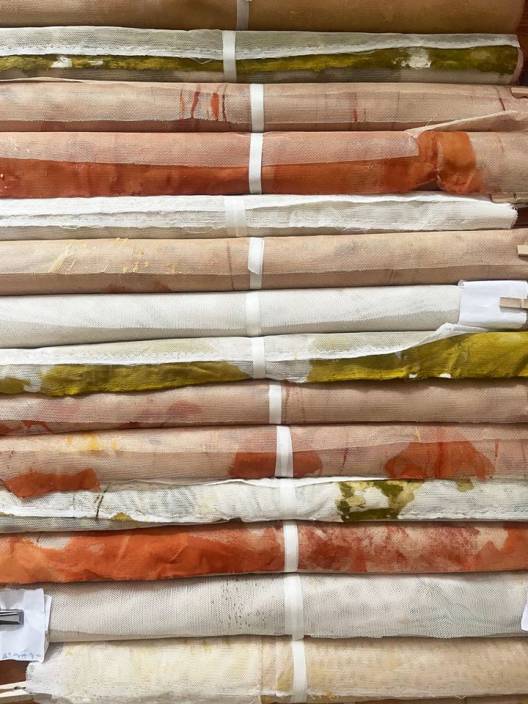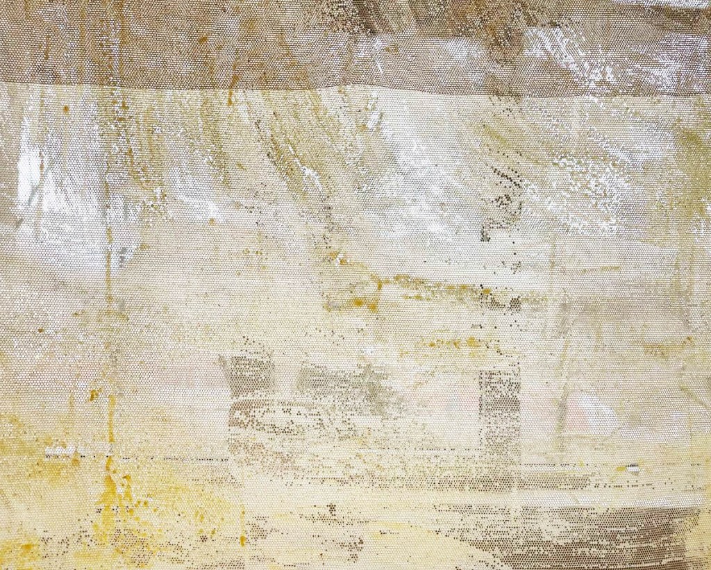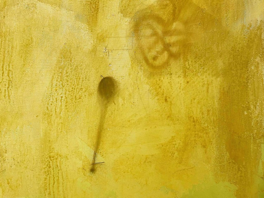 Cabane-ruche ★ Installation réalisée en co-création avec les 6èmes A ★ tulle, encaustique à la cire d’abeille et ocres, objets glanés, dessins au broux de noix sur papier calque, épingles, fil de cuivre, photocopies ★ dimensions variables ★ en décembre 2025-janvier 2026 : installée au LAC du Collège de la Largue / du 13 au 15 février 2026 : installée au CRAC Alsace avec la vidéo conférence-performance science-fiction sur L’enquête des abeilles messagères