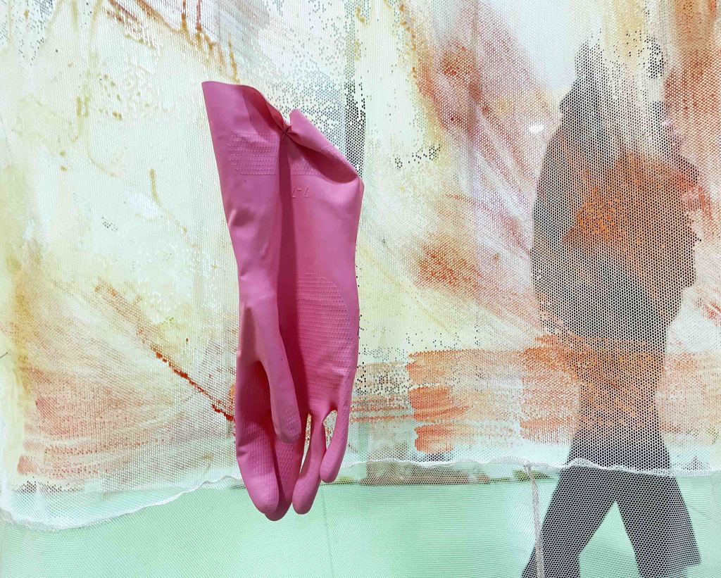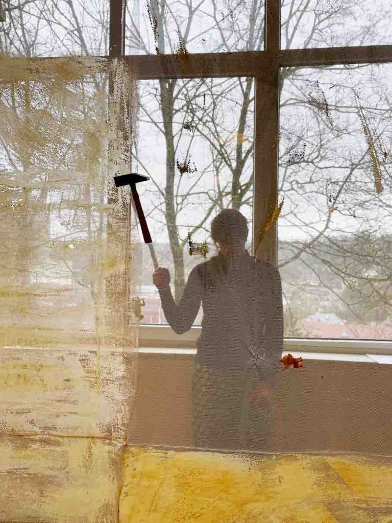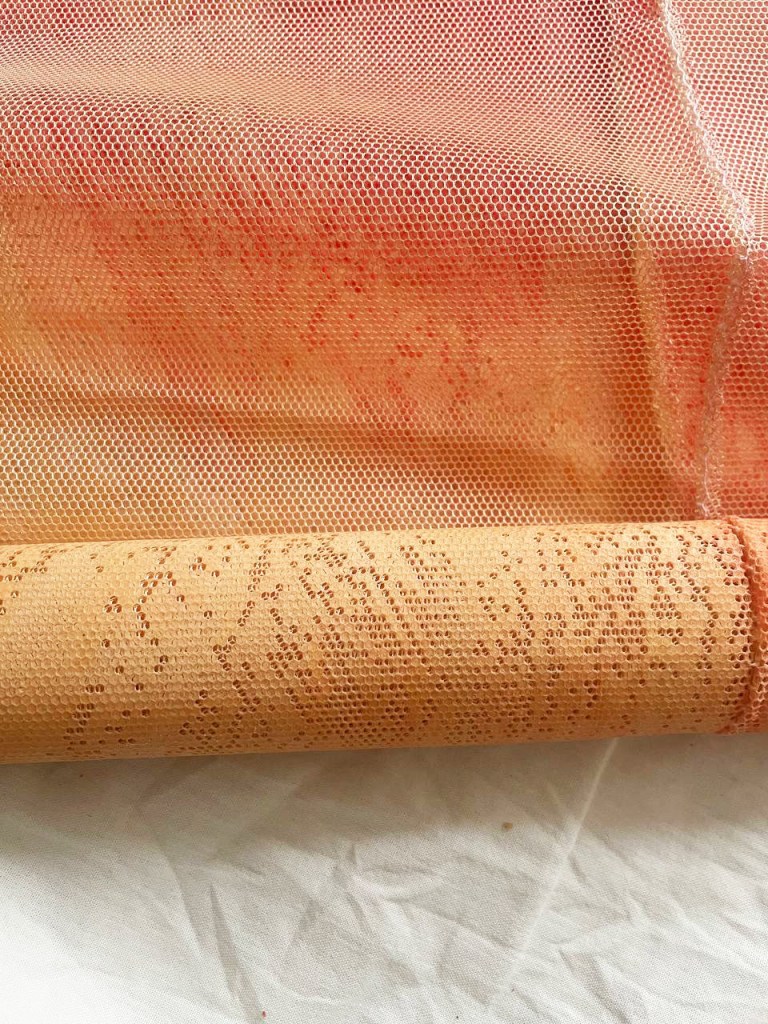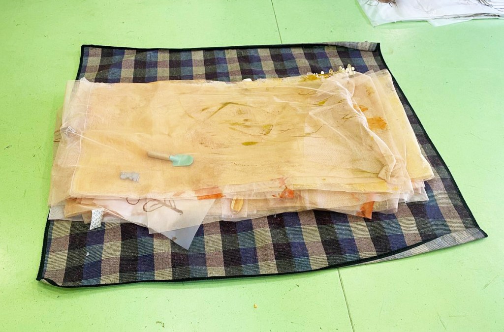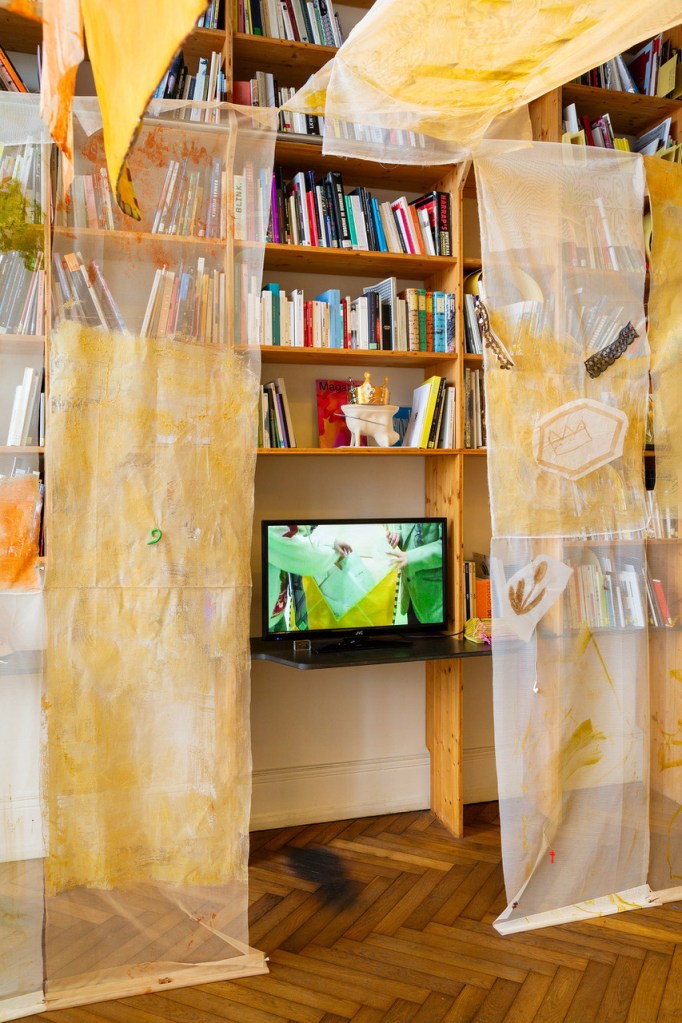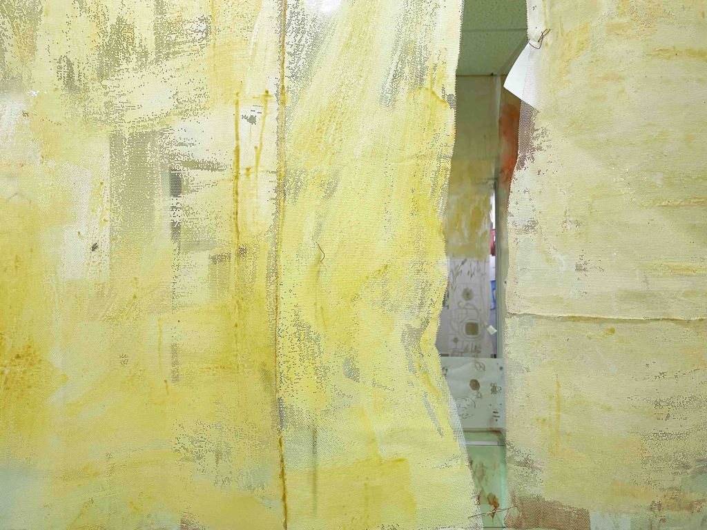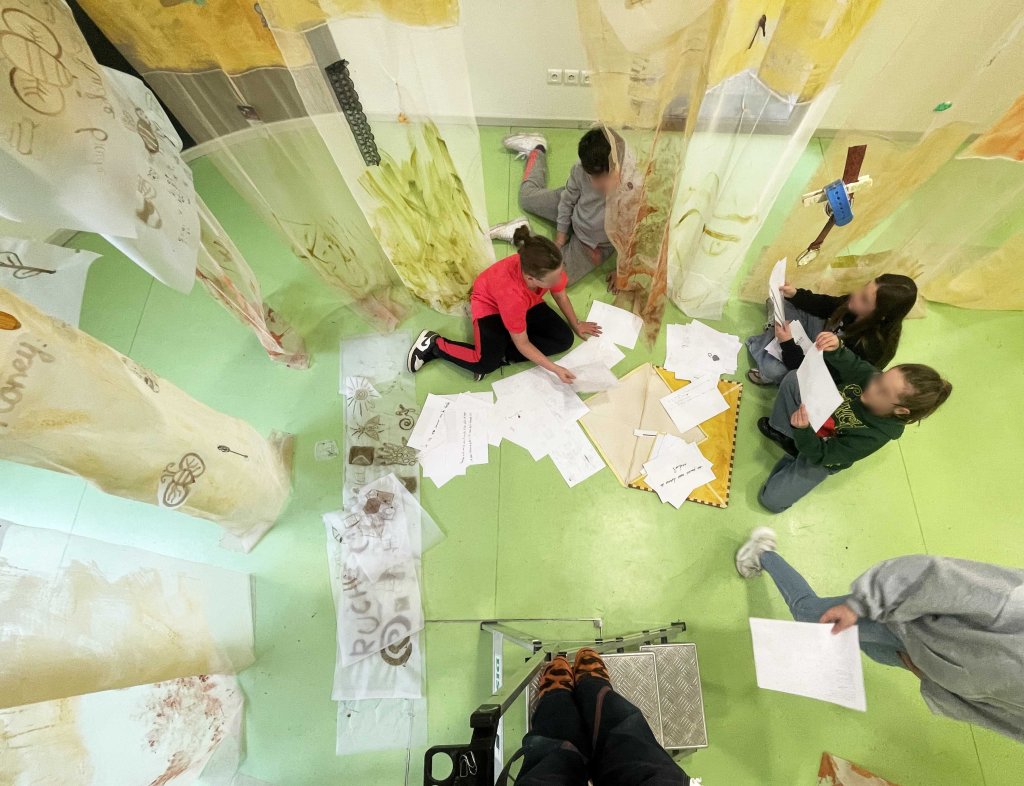 Cabane-ruche ★ Installation réalisée en co-création avec les 6èmes A ★ tulle, encaustique à la cire d’abeille et ocres, objets glanés, dessins au broux de noix sur papier calque, épingles, fil de cuivre, photocopies ★ dimensions variables ★ en décembre 2025-janvier 2026 : installée au LAC du Collège de la Largue / du 13 au 15 février 2026 : installée au CRAC Alsace avec la vidéo conférence-performance science-fiction sur L’enquête des abeilles messagères