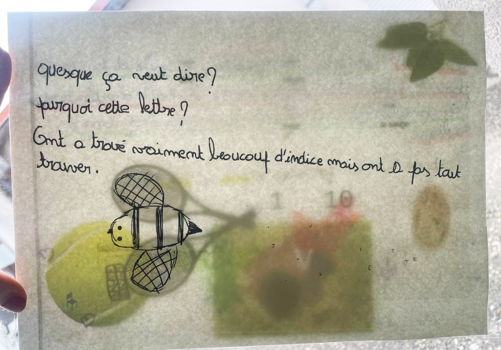La première lettre envoyée par les Abeilles aux 6A (via vibration d’imprimante) : point de départ de l’enquête !