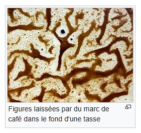 « La lecture dans le marc de café est aussi enracinée dans nos mœurs que l’art de tirer les cartes. Voici comment on procède : On prend du marc très sec ; on le délaye dans de l’eau tiède et on verse cette mixture sur une assiette bien blanche, en ayant soin de remuer au fur et à mesure que l’on verse, de manière à égaliser la couche sur toute la surface de l’assiette. On égoutte doucement et il ne reste alors que le marc de café qui forme une multitude de dessins bizarres. La lecture commence par une étude de ces dessins. On se rend bien compte des figures formées par les grains et on leur donne les significations suivantes : […] » (suivent alors des interprétations selon la forme que l’observateur peut imaginer par paréidolie)