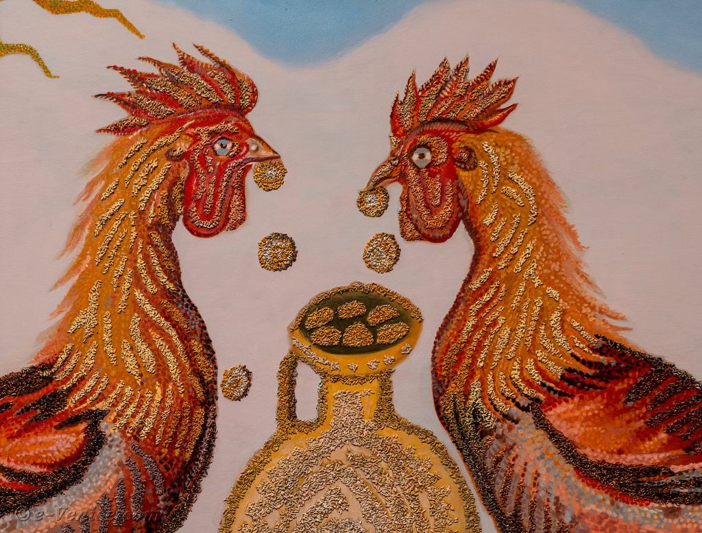 Allison Katz, Be nice (détail) – peinture avec coqs et grains de riz