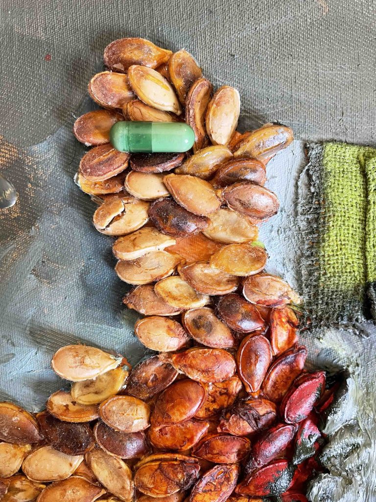 en plantant les graines de cour(a)ge sur la toile, je pensais à un passage de Locus Solus : la description d’une mosaïque pittoresque composée de dents plantées